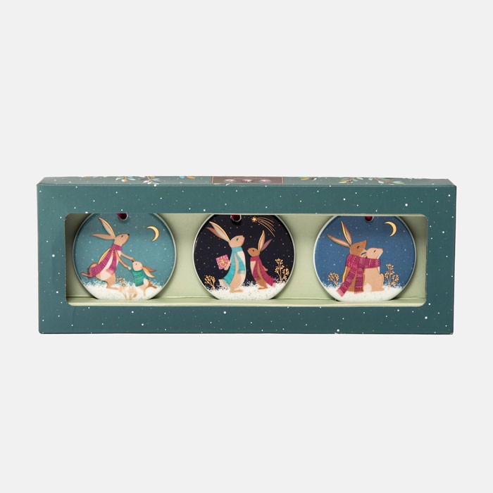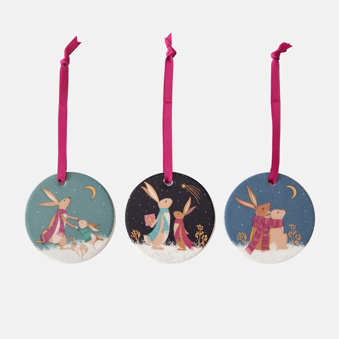 Featuring endearing woodland rabbits in an array of enchanting winter scenes, this trio of ceramic Woodland Tales Ornaments from Sara Miller London will add an extra touch of charm to your Christmas. Each porcelain disc includes a hole so you can add your choice of ribbon and hang as tree decorations if desired. Adorned with our signature gold detailing, this set makes a precious gift for a loved one, or a welcome addition to your own home this festive season.