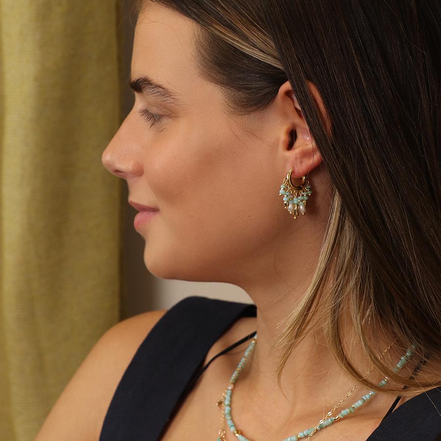 Mixed aqua, gold and pearl hoop earrings with irregular disc