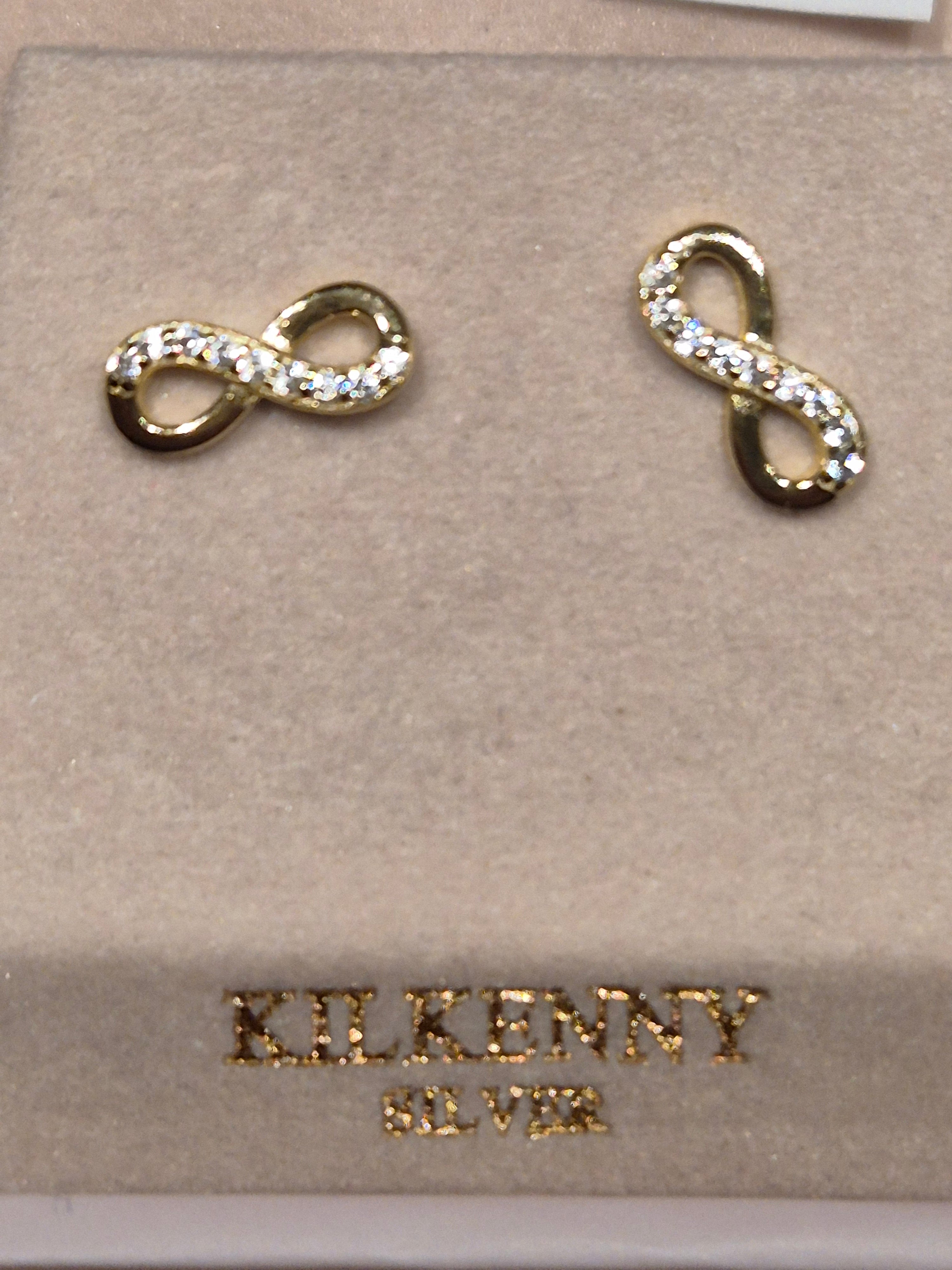 An elegant pair of sterling silver infinity earrings with cubic zirconia detail. There is an anti-tarnish coating on the earrings and they measure approx. 9mm in width.
