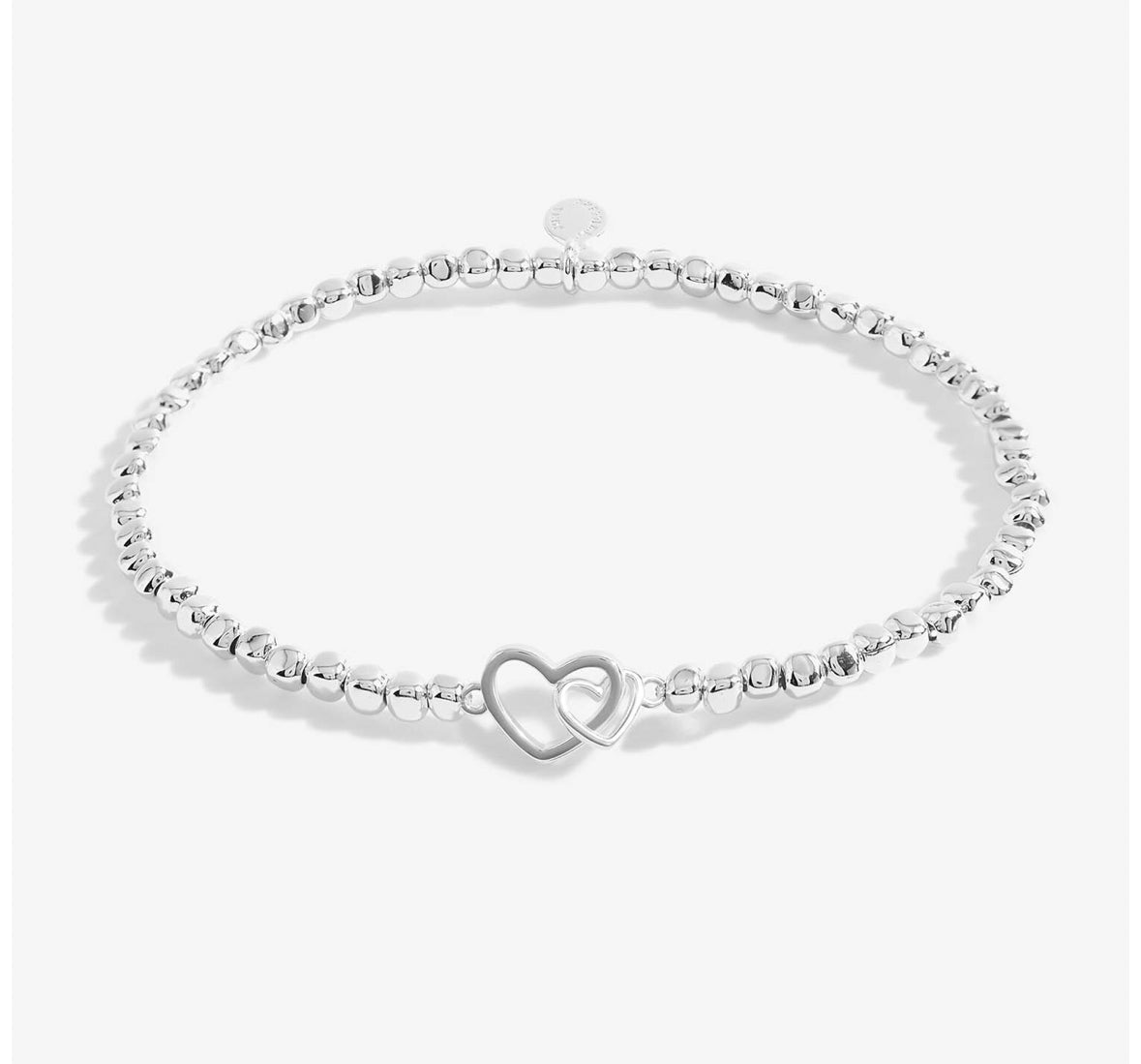 Discover our Forever Yours Collection, made to be treasured for a lifetime.This beautiful bracelet features a silver-plated hammered bead design with a shimmering heart-shaped interlocked charm. Complete with a pretty blush pink card which has been stamped with the sentiment 'Marvellous Mum' and a sweet poem. Perfect for celebrating every milestone birthday or Mother's Day.