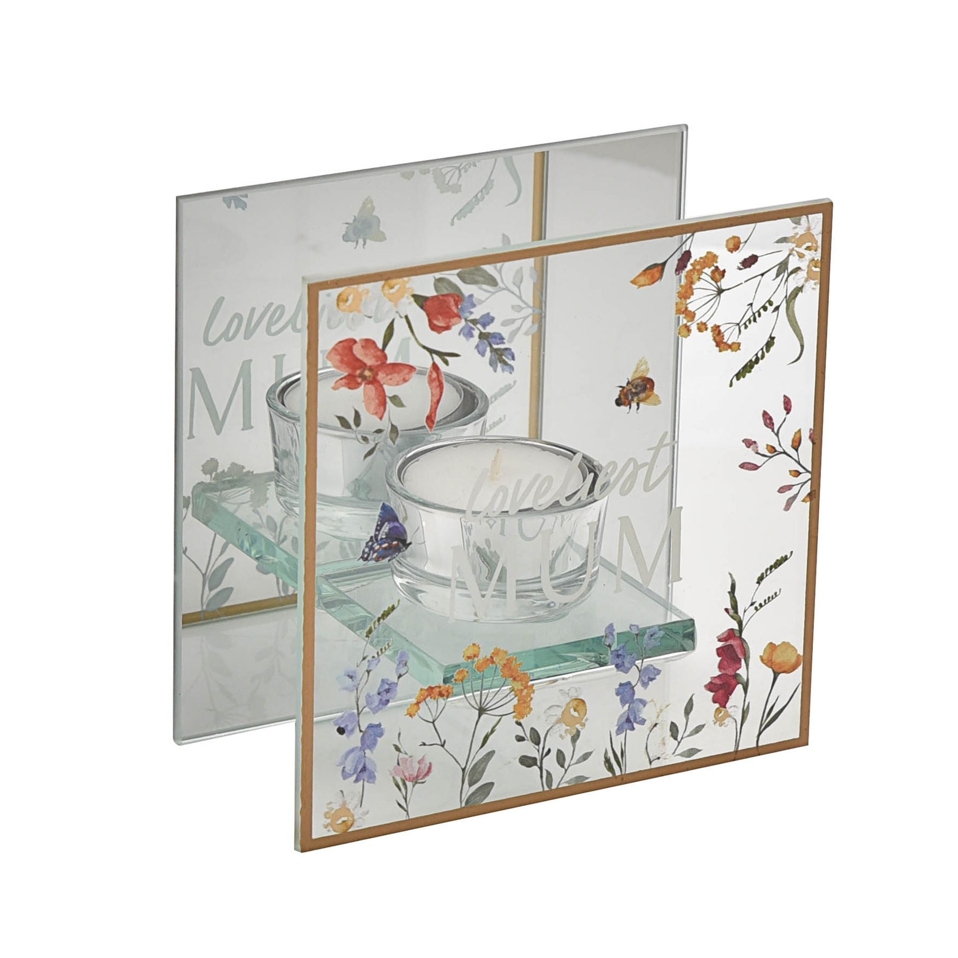 A tea light holder from The Cottage Garden by CELEBRATIONS®. This attentively decorated tea light holder makes a fitting tribute to a mother. The square, mirrored glass holder is bridged by a thick, glass stand on which to place a tea light of choice. The front panel is adorned with ‘Loveliest Mum’ decal and surrounded by a beautiful wildflower design. The tea light holder is packaged in a repeat closed box.