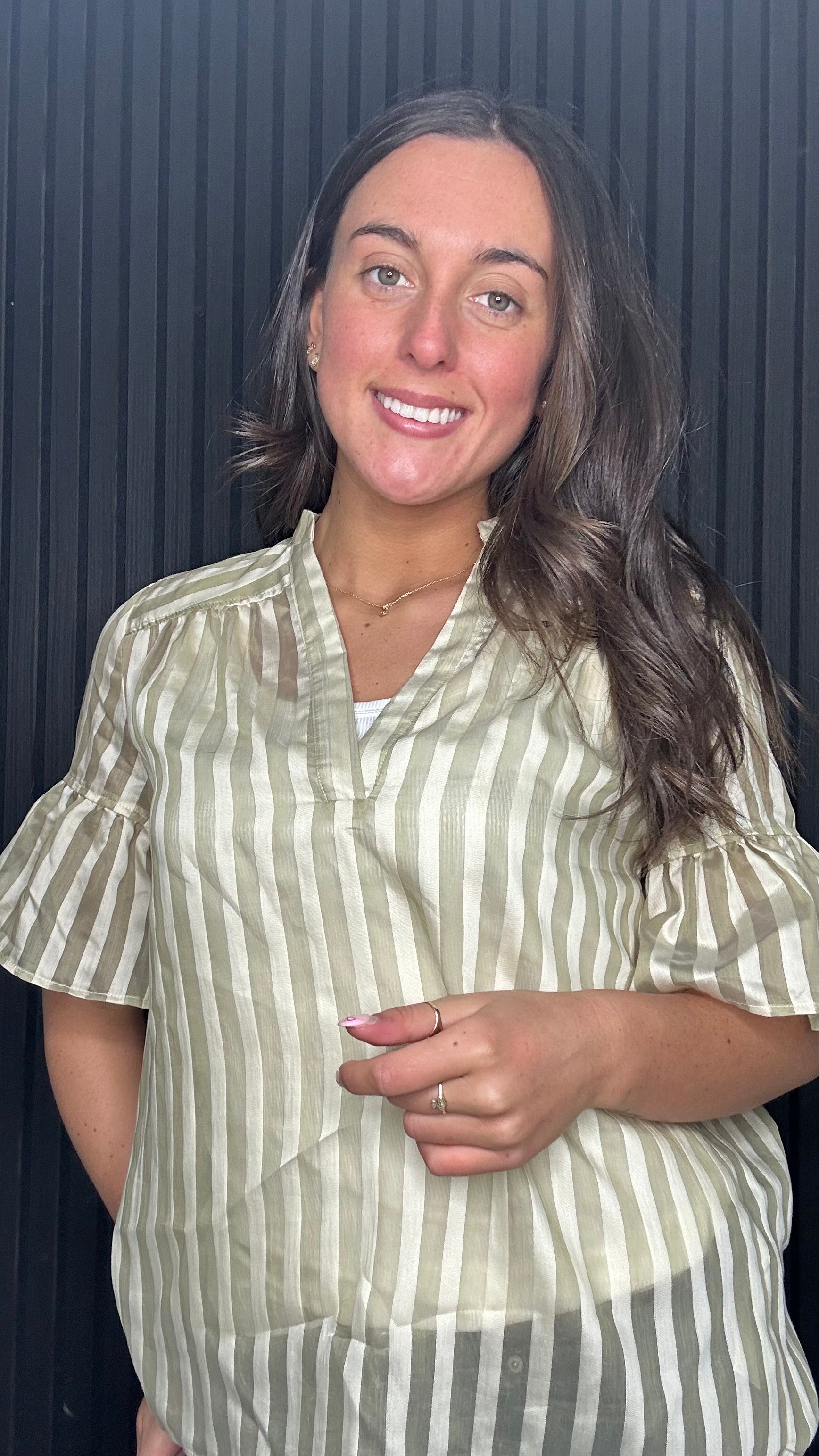 Cream and green striped blouse with V-neck and frill sleeves. Lightweight top perfect for everyday and summer styling.