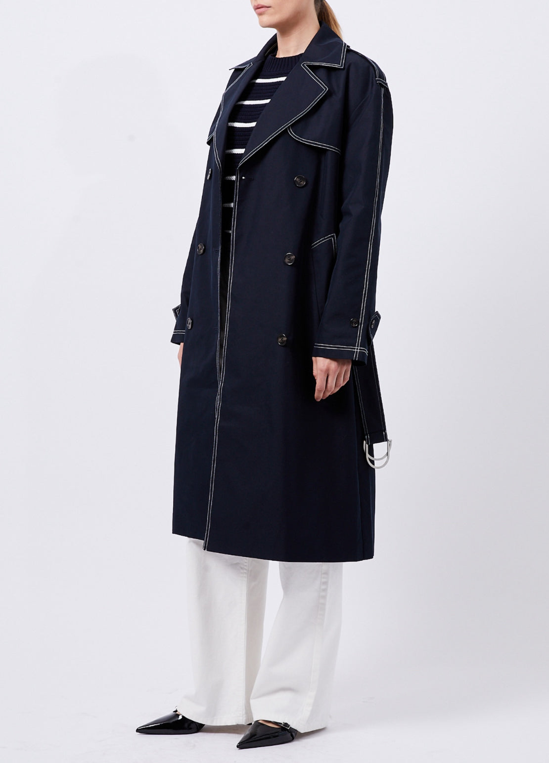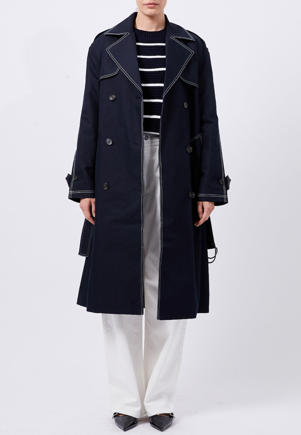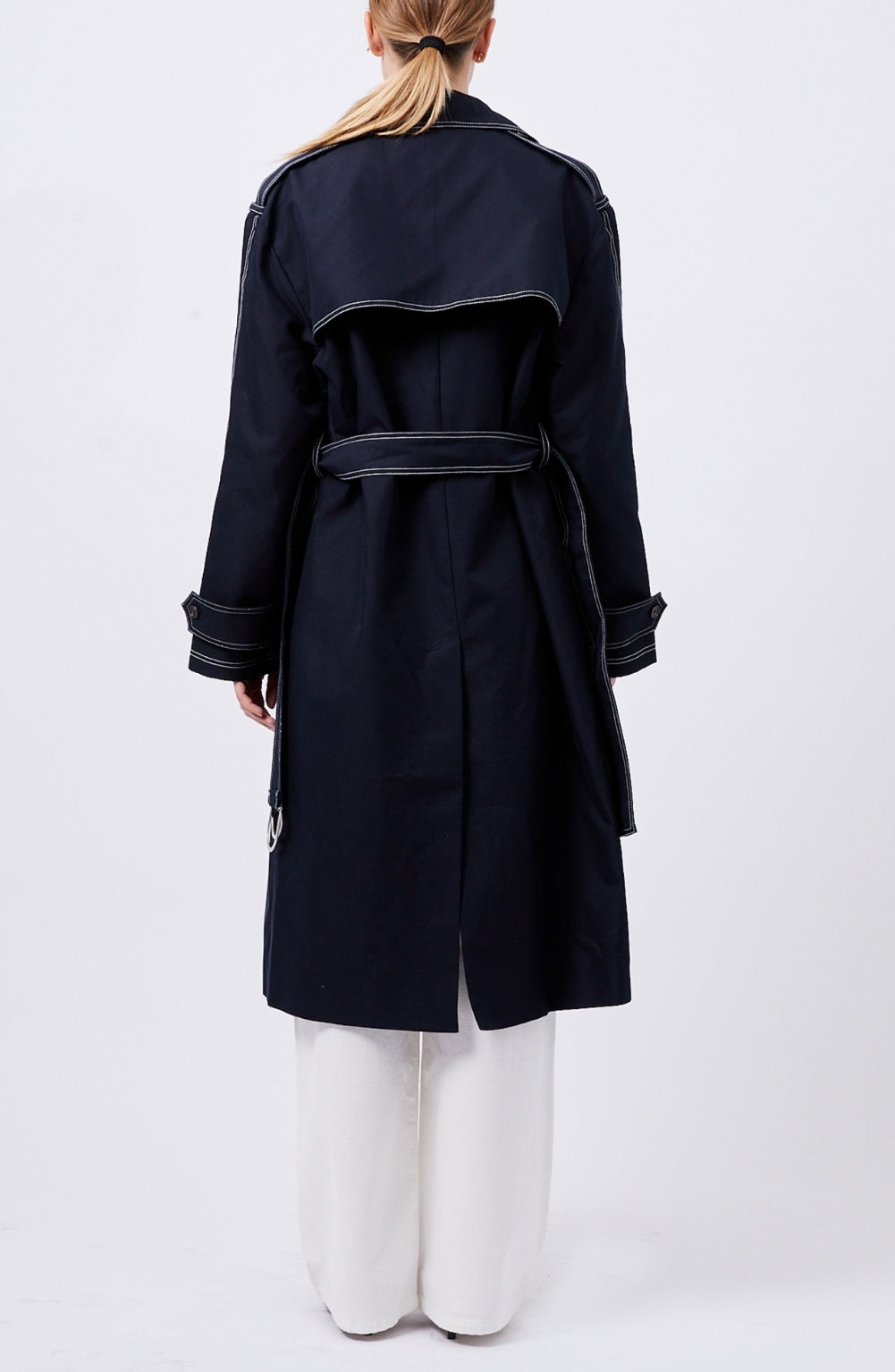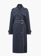 Our Afton Contrast Stitch Belted Trench Coat updates a timelessly traditional silhouette with contemporary flair. This double-breasted trench coat features the napoleon collar, storm flap, epaulettes and deep back yoke in a textured finish with contrasting top stitching.