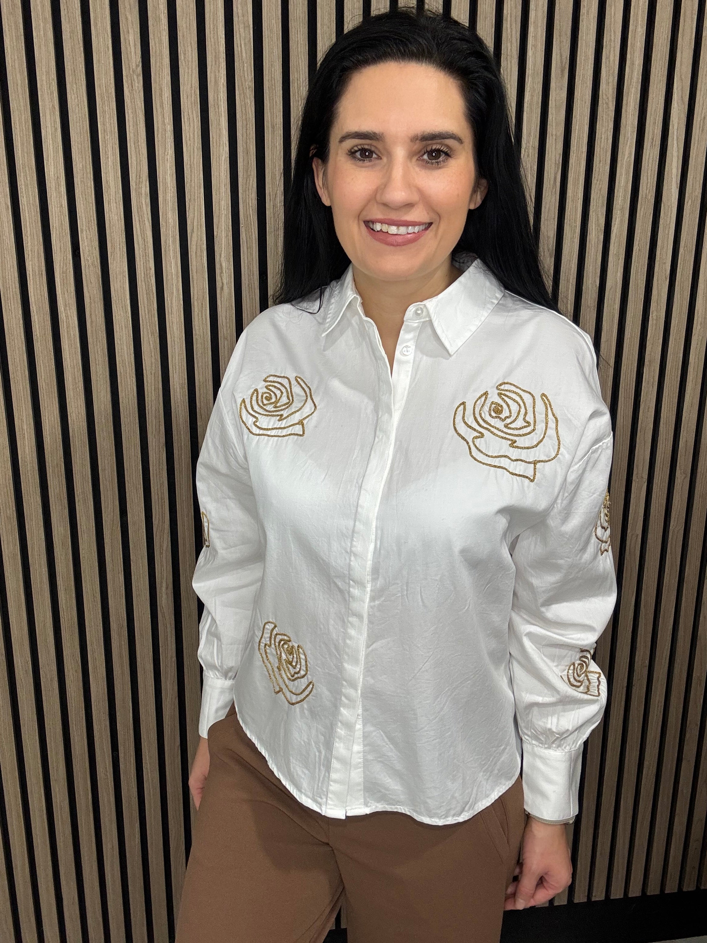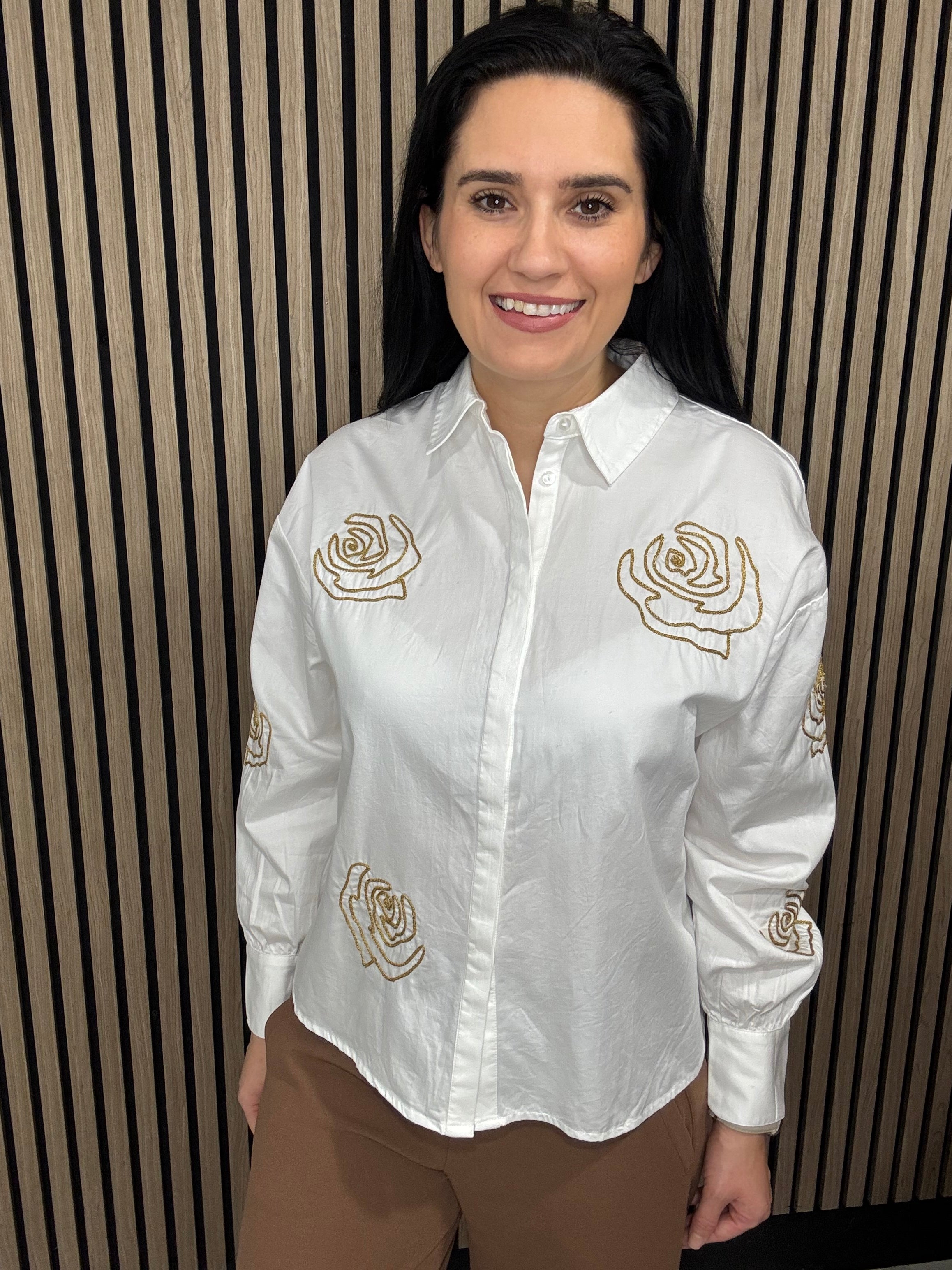 Stop and sketch the roses. Our Alexis Cotton Flower Embellished Shirt features a sharp collar and clean concealed buttons whilst gold toned floral embroidery dances across its long sleeved silhouette.