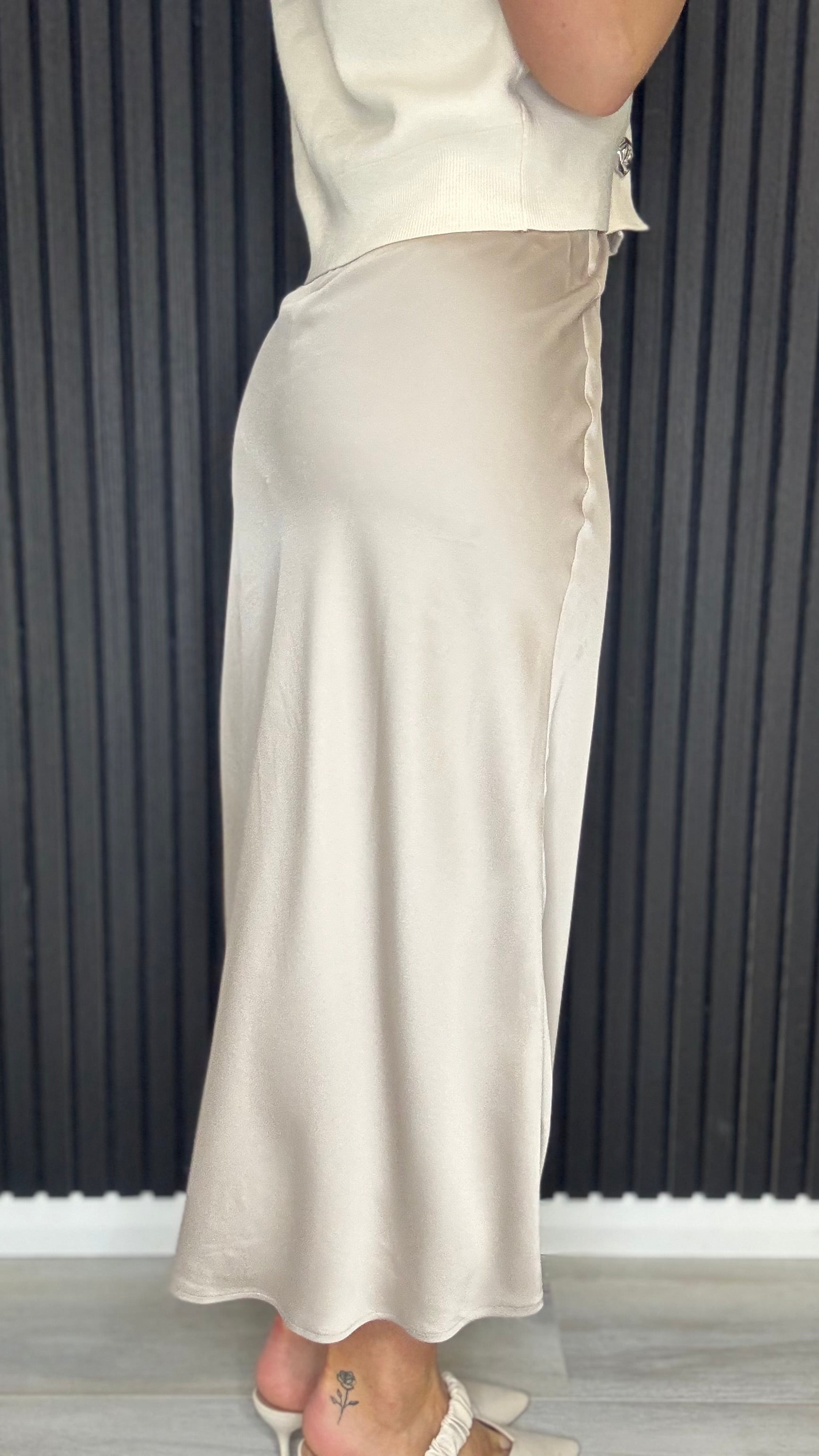 Elegant satin slip skirt in dove grey with a flattering midi length. The Margo skirt is a versatile wardrobe staple for everyday and occasion styling.