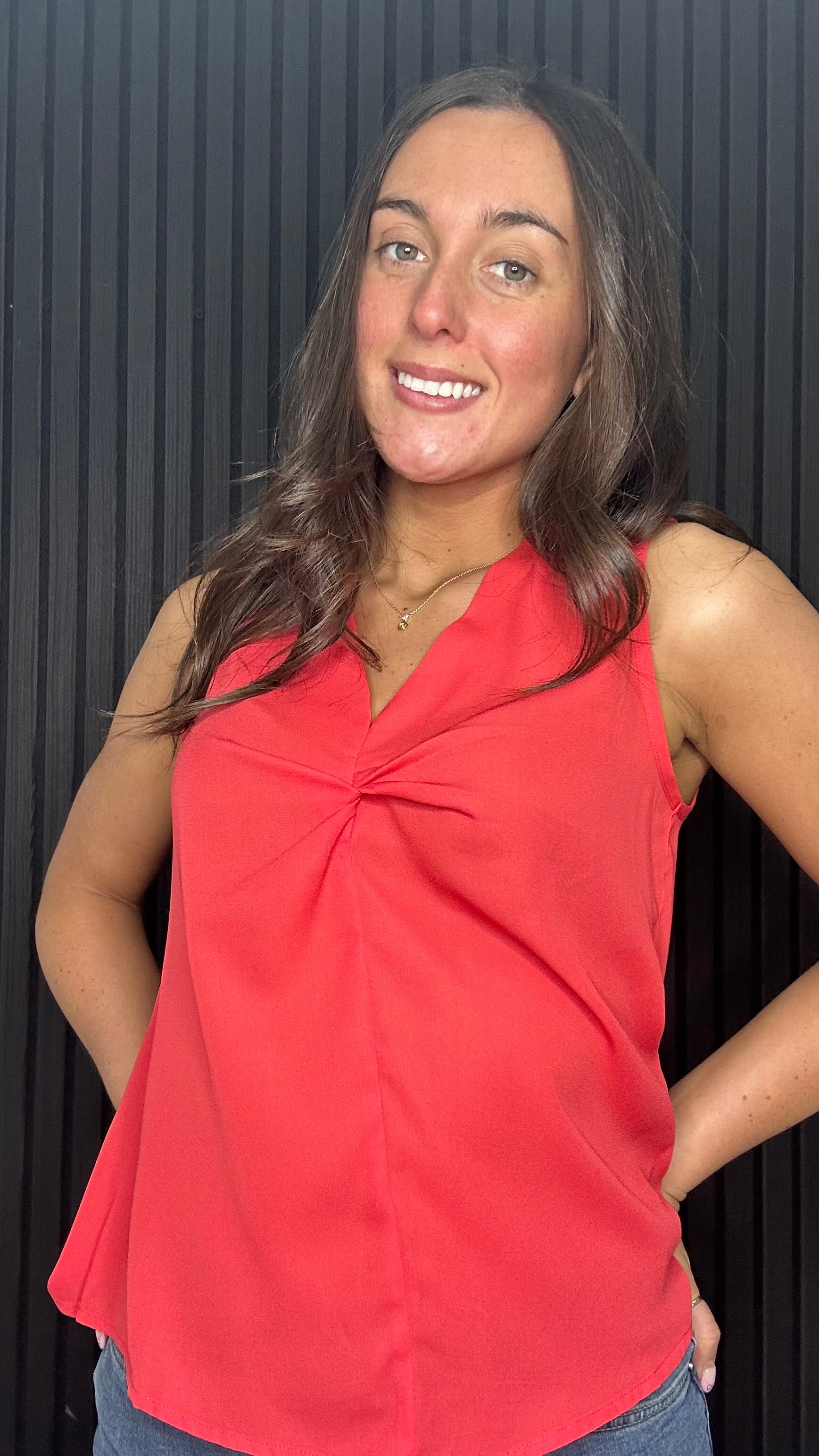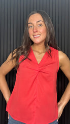 A pop of bold. Our Mila Georgette Front Twist Top features a plunging v-neckline with a soft front knot detail, giving its sleeveless silhouette a modern yet polished look.