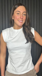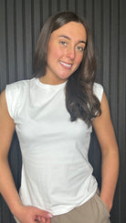 Linen white shoulder pad top with structured fit. Stylish sleeveless t-shirt perfect for smart casual and everyday wear.