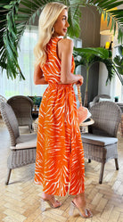 Our Blood Orange Printed Cut Out Midi Dress is the perfect day to night dress! Featuring a round neckline, no sleeves, elasticated waist, cut out detail and a midi length skirt. Pair with white trainers for the perfect day time look, then switch to barely there heels and a some simple jewellery for a sophisticated evening look.