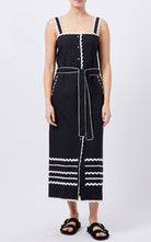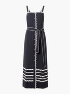 Playful detailing gives our timeless Cambria Cotton Ric Rac Dress a charming edge. This black midi dress is elevated by decorative trims featuring clover shaped buttons, side pockets and matching self-tie belt.