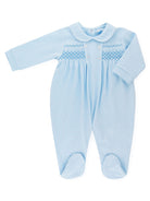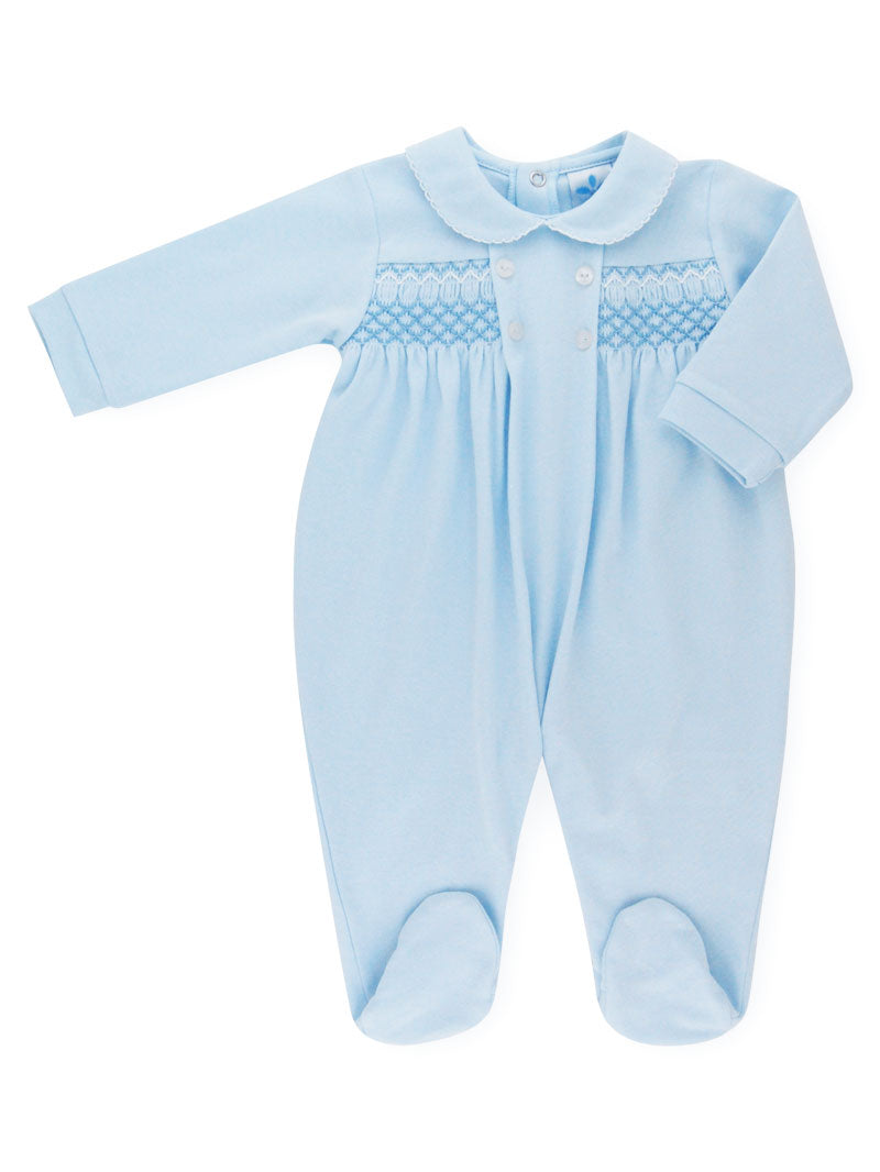 Two piece baby boy Spanish dungaree set. Short sleeve white top with collar, and blue trim to sleeves. Popper back fasting to shirt. Blue dungarees with very small white polka dot design. Popper fastening to straps.