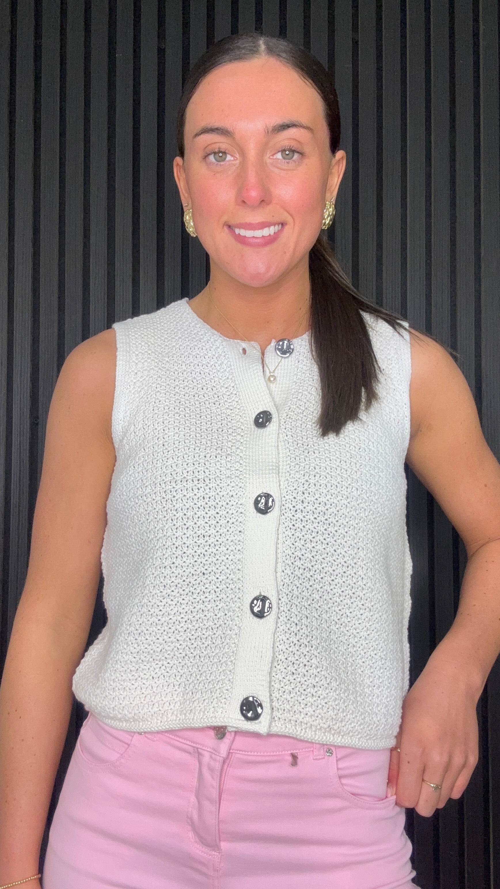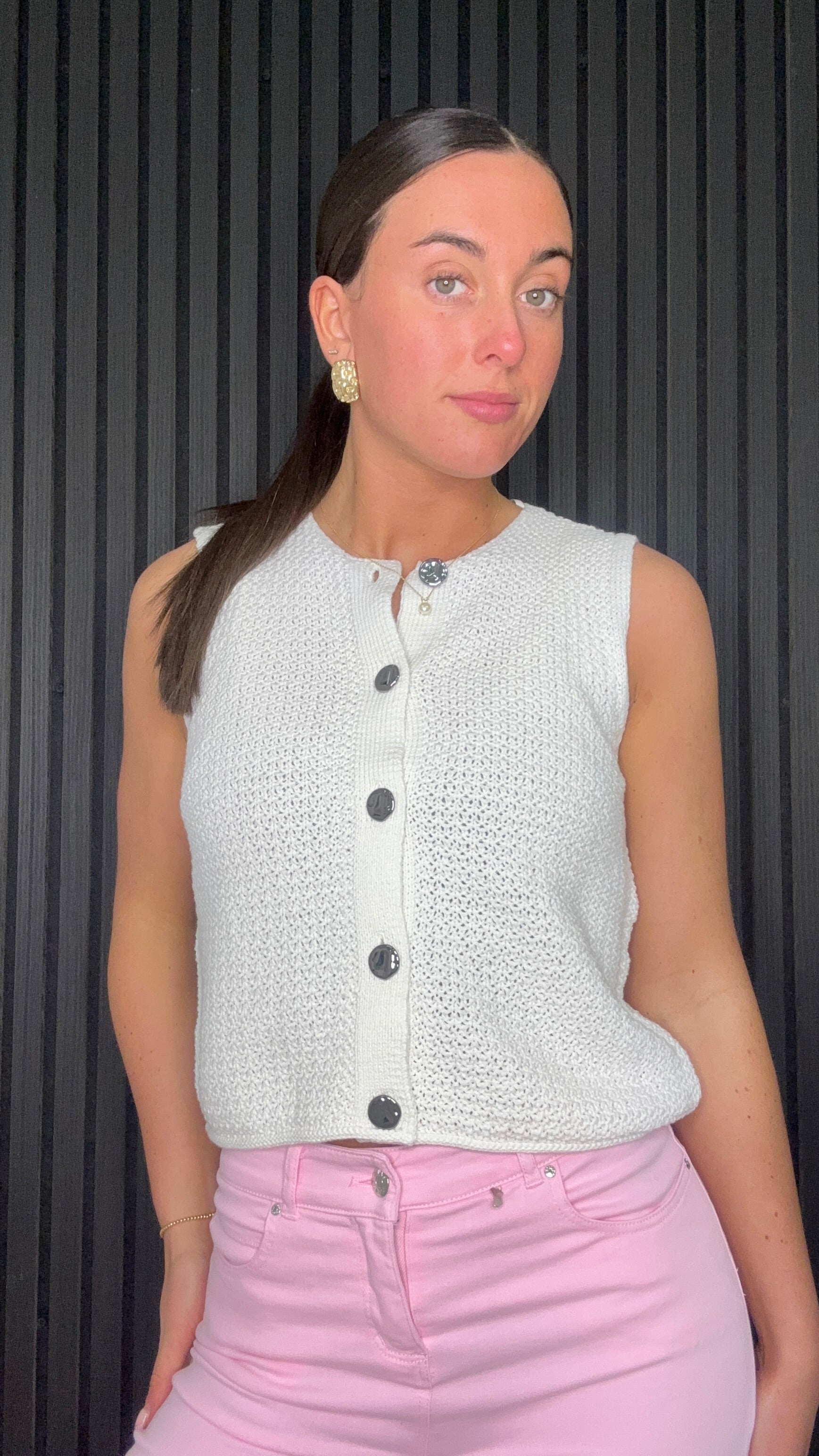 Women’s fog knitted vest with button front. Stylish sleeveless knit perfect for layering with everyday outfits.
