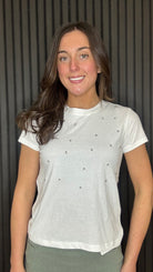 The Hester Tee is a chic everyday essential with a subtle statement. Designed in classic white with delicate stud embellishment, this short sleeve t-shirt adds just the right amount of sparkle while staying effortlessly wearable. Featuring a flattering relaxed fit and soft stretch fabric, it pairs perfectly with jeans, tailored trousers or skirts for an easy day-to-night look.