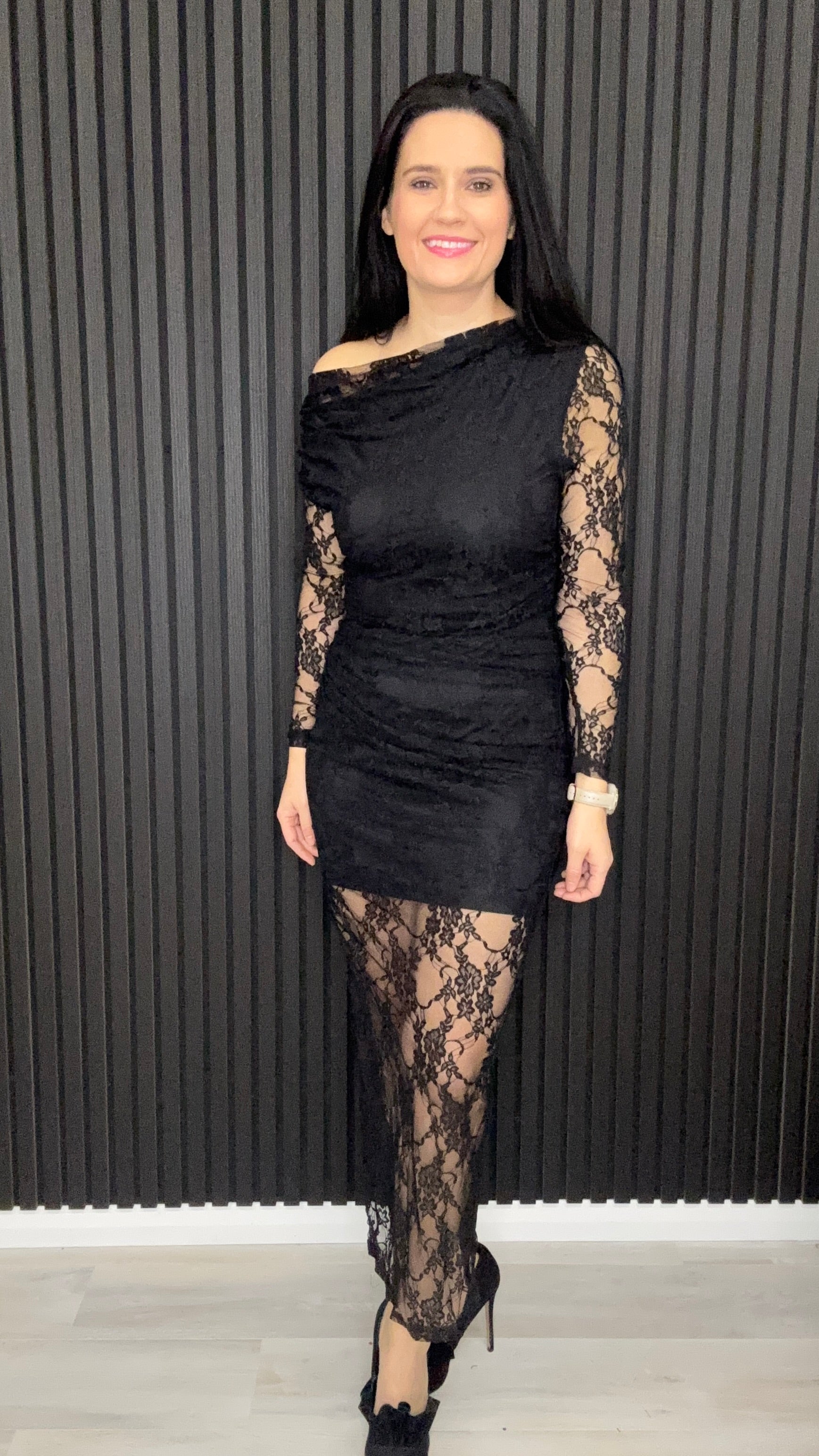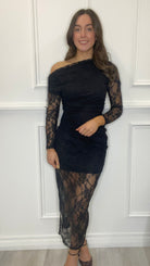 Feel sophisticated all night long in our Black Lace Overlay Off The Shoulder Long Sleeve Midi Dress. Featuring all over lace fabric, an open off the shoulder neckline, ruched shoulder detailing, a draped effect, mini lenght body lining, unlined lace sleeves and a midi lace skirt with side split. Pair with some statement jewellery and heels to complete the look!
