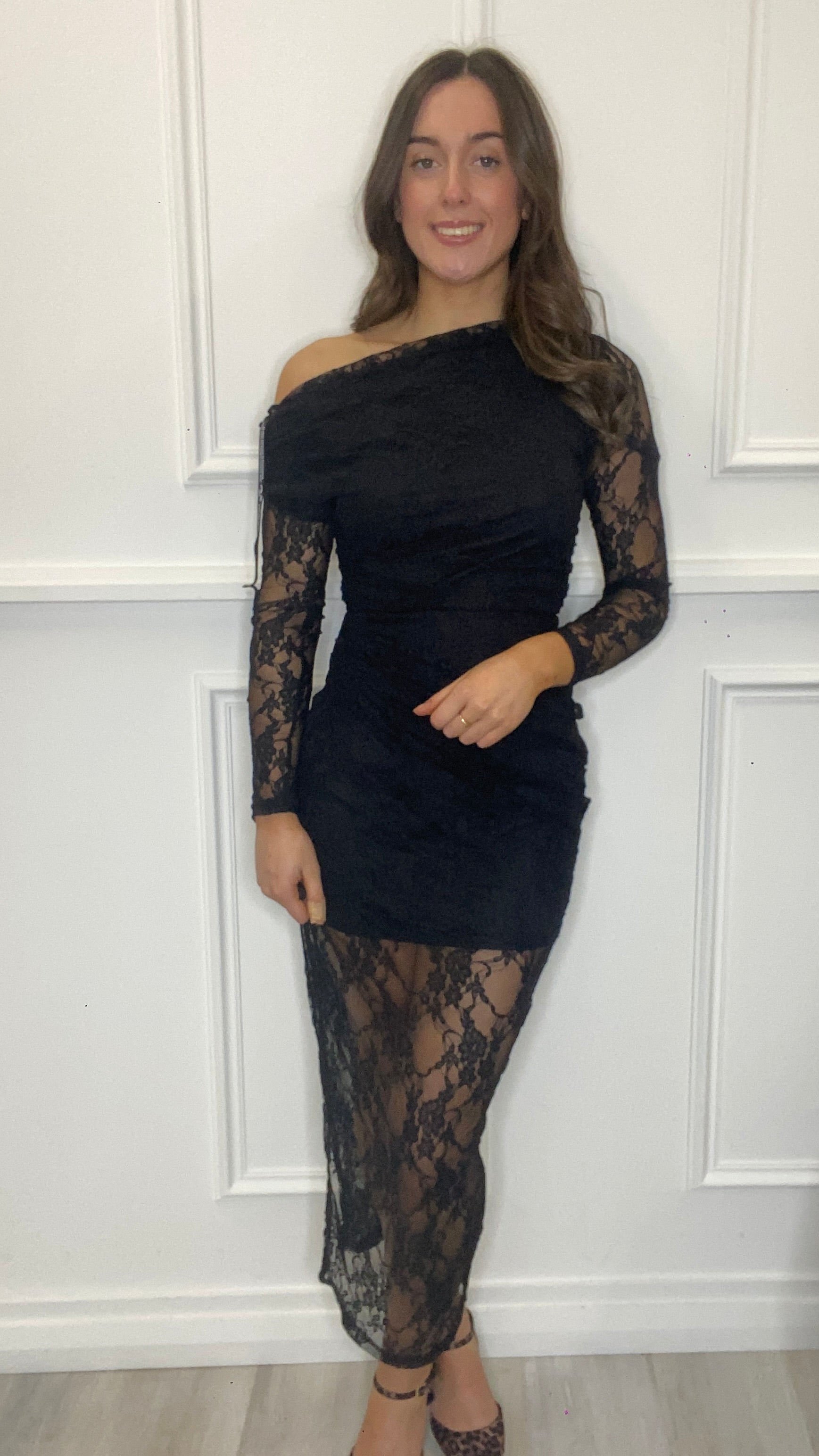 Black Lace Overlay Off The Shoulder Long Sleeve Midi Dress