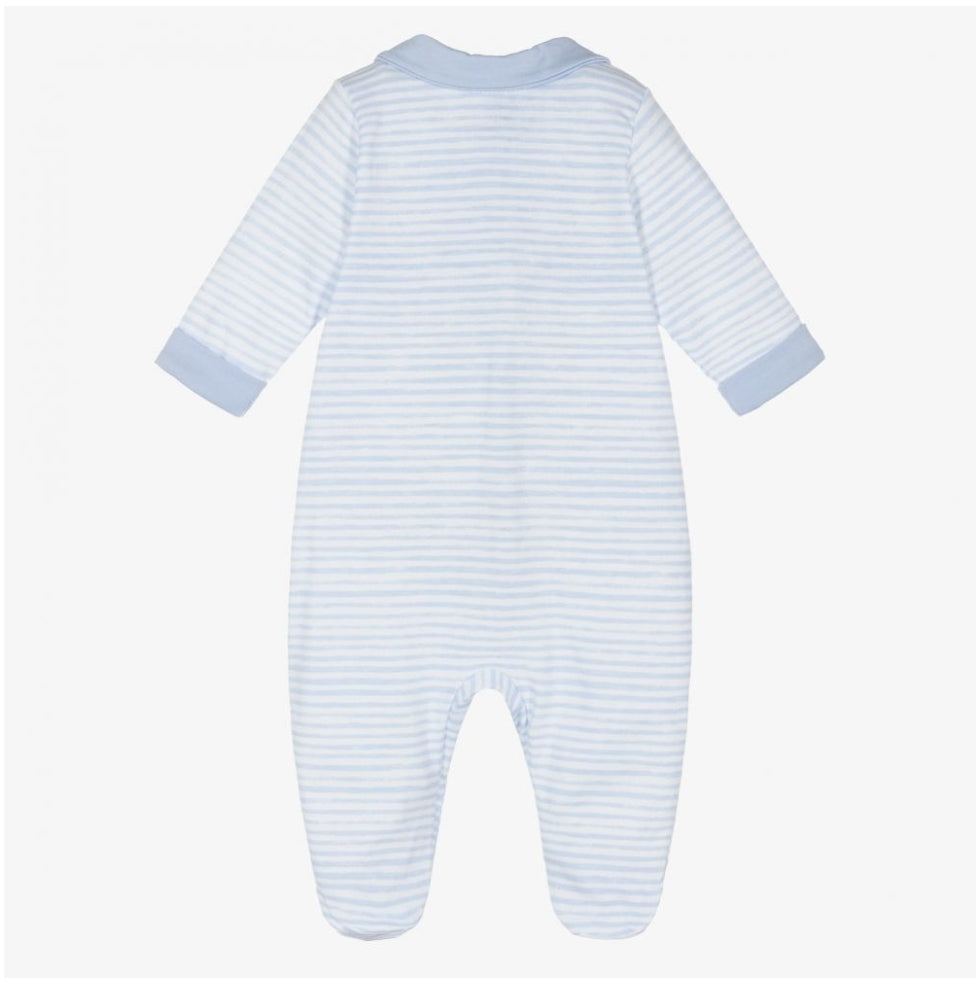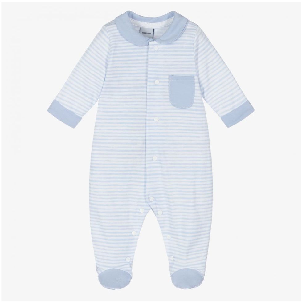 Adorable sea green babygrow for baby boys and girls by Babidu, patterned with a cute white stars print. Made from soft and stretchy cotton jersey, it has a lovely rounded collar, and a small chest pocket with contrast white stitching.