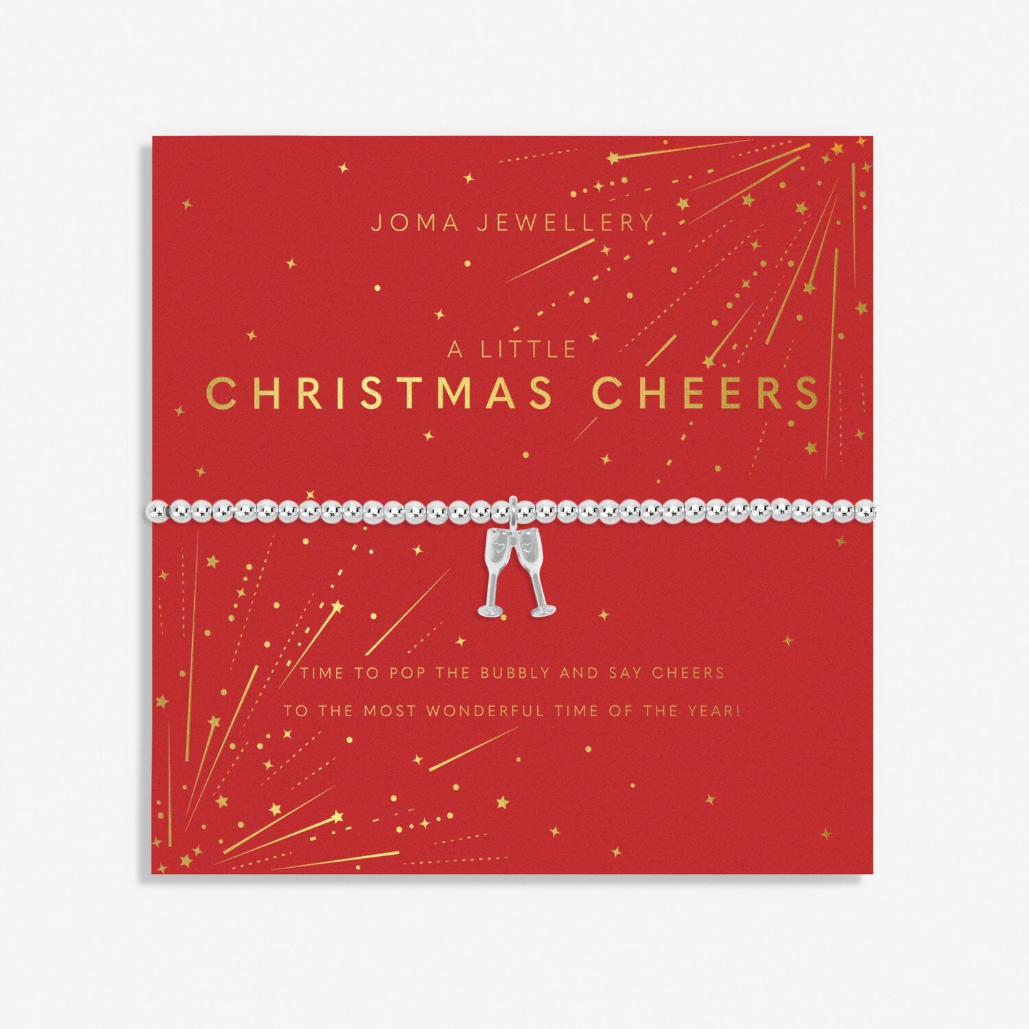 Capture every magical moment with your loved ones this festive season with Christmas A Little bracelets! Made to last and be loved for a lifetime, our Christmas A Little 'Christmas Cheers' bracelet in silver plating is threaded with our classic silver-plated beads and decorated with a champagne cheers charm to represent Christmas celebrations and time spent with loved ones. Wrapped around a shimmering starburst-print card and framed by a sweet poem, it's sure to make a wonderful stocking filler or under-the-tree treat.
