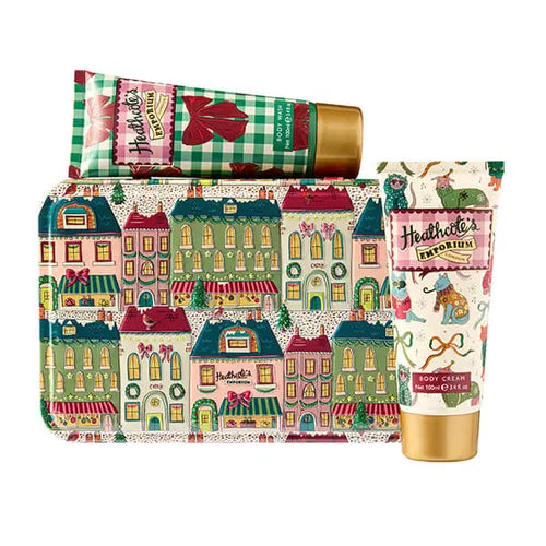 This delightful Heathcote's Emporium Body Wash & Body Cream in Tin 100ml in an embossed keepsake tin, illustrated with inviting Christmas shop windows, is filled with two luxurious bath and body treats, making it the perfect beauty gift for her.