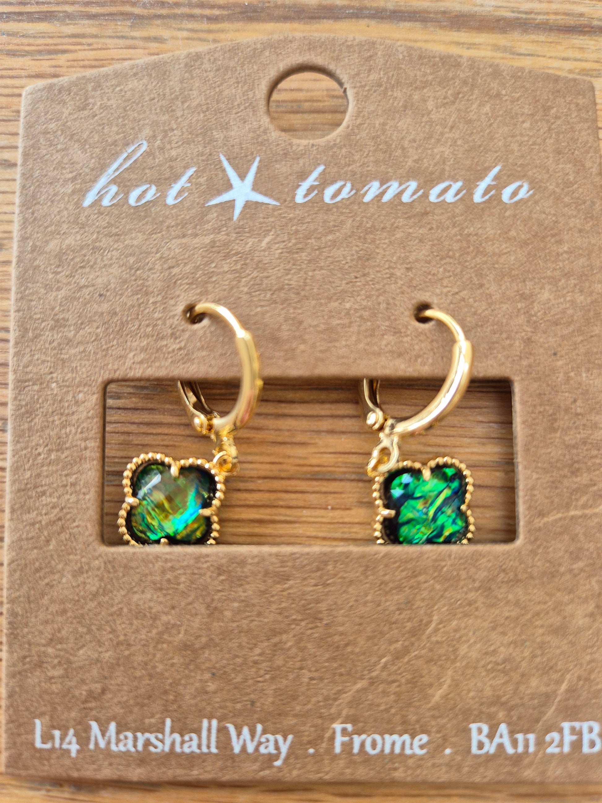 Gold blue green iridescent clover drop earring