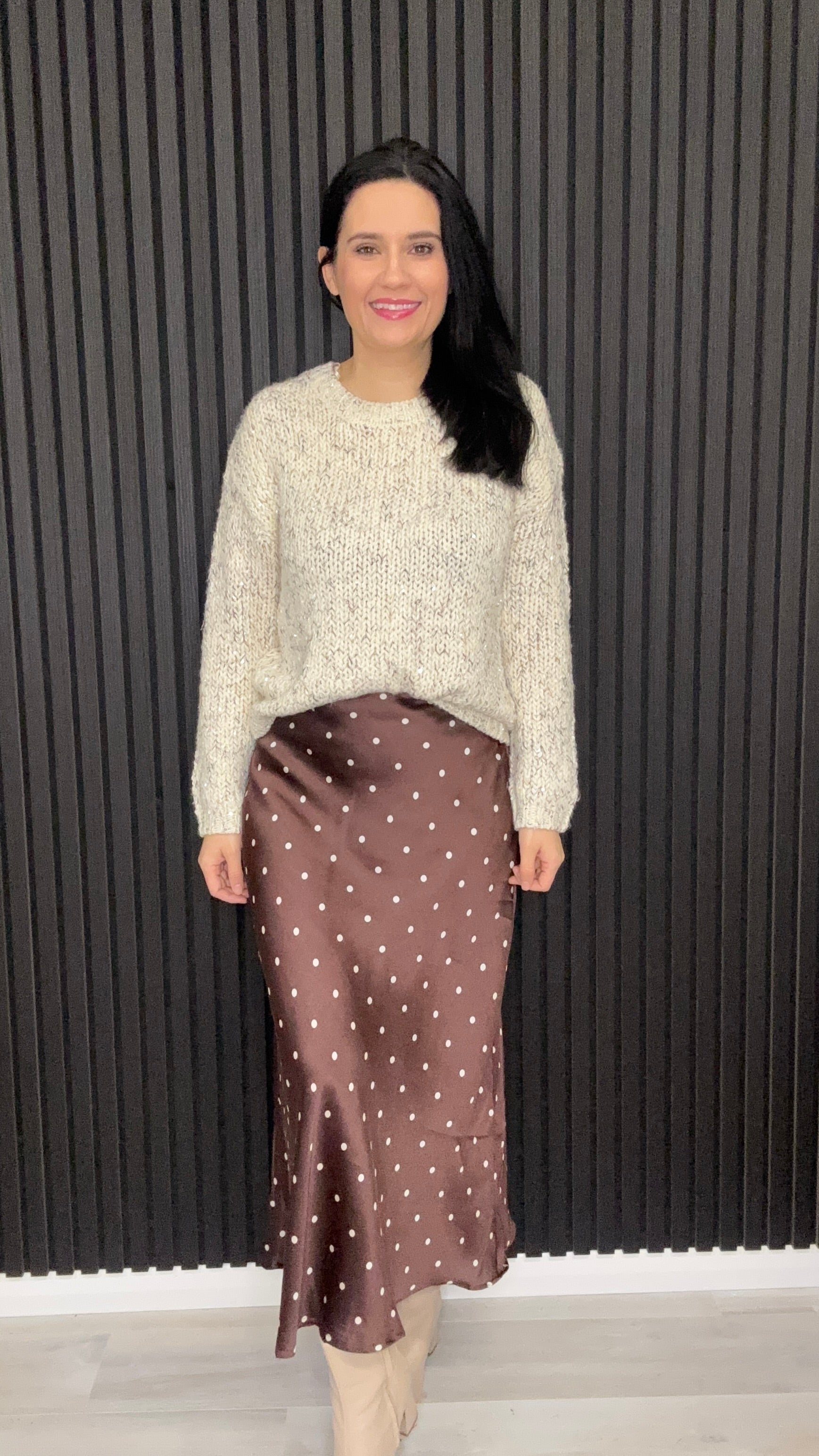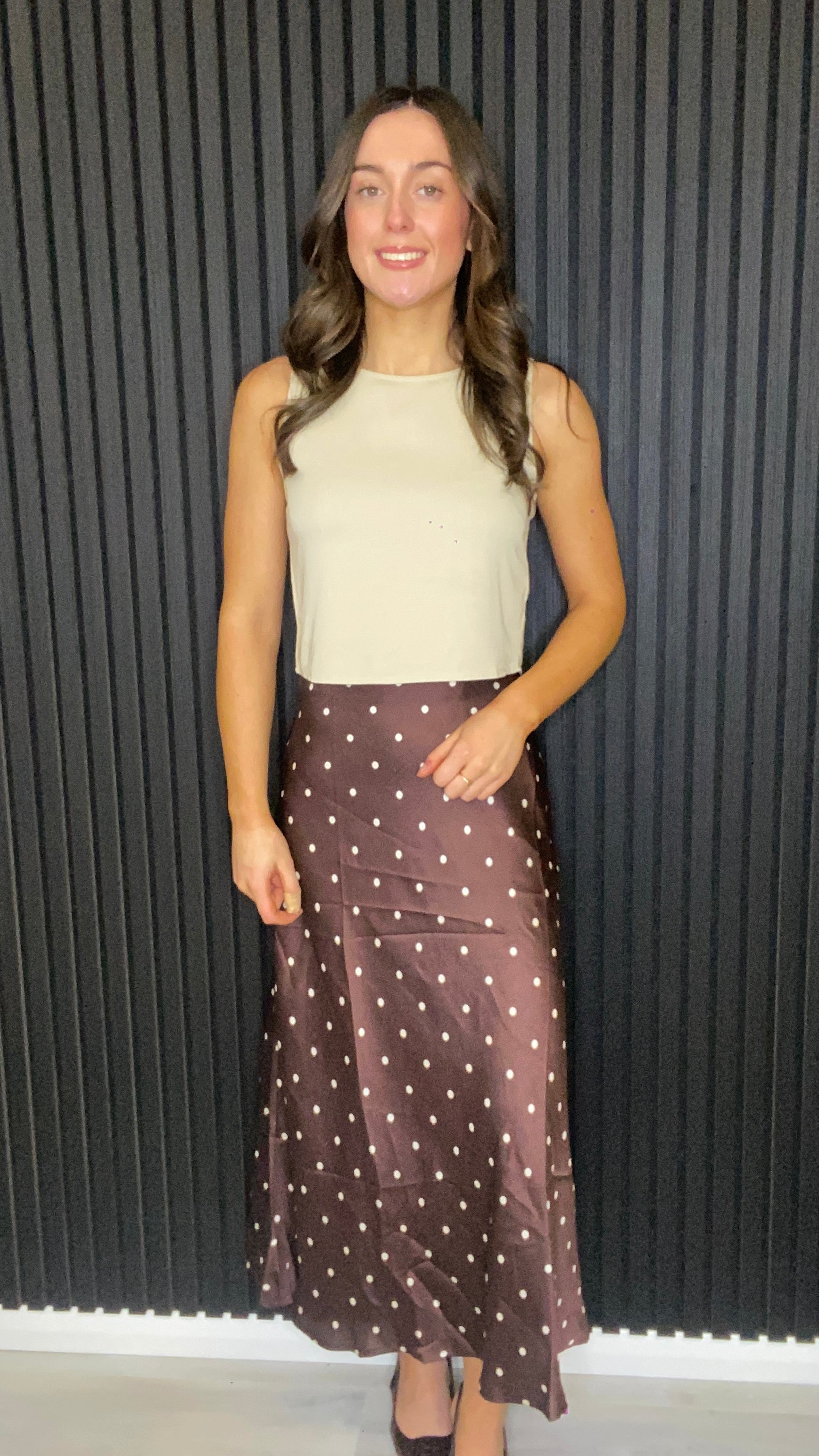 Hailey Satin Midi Skirt Brown & Cream Dots