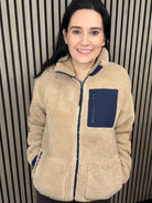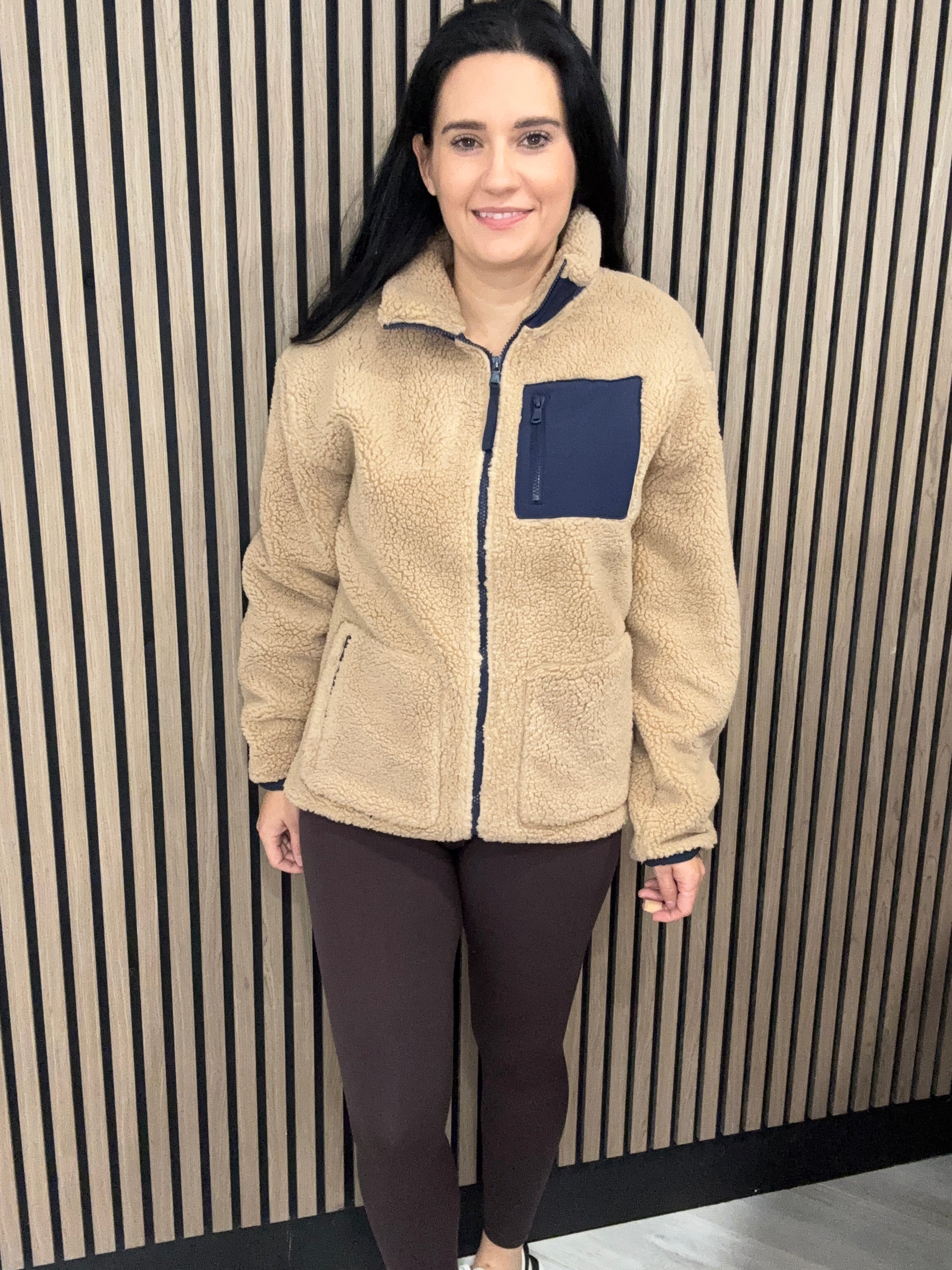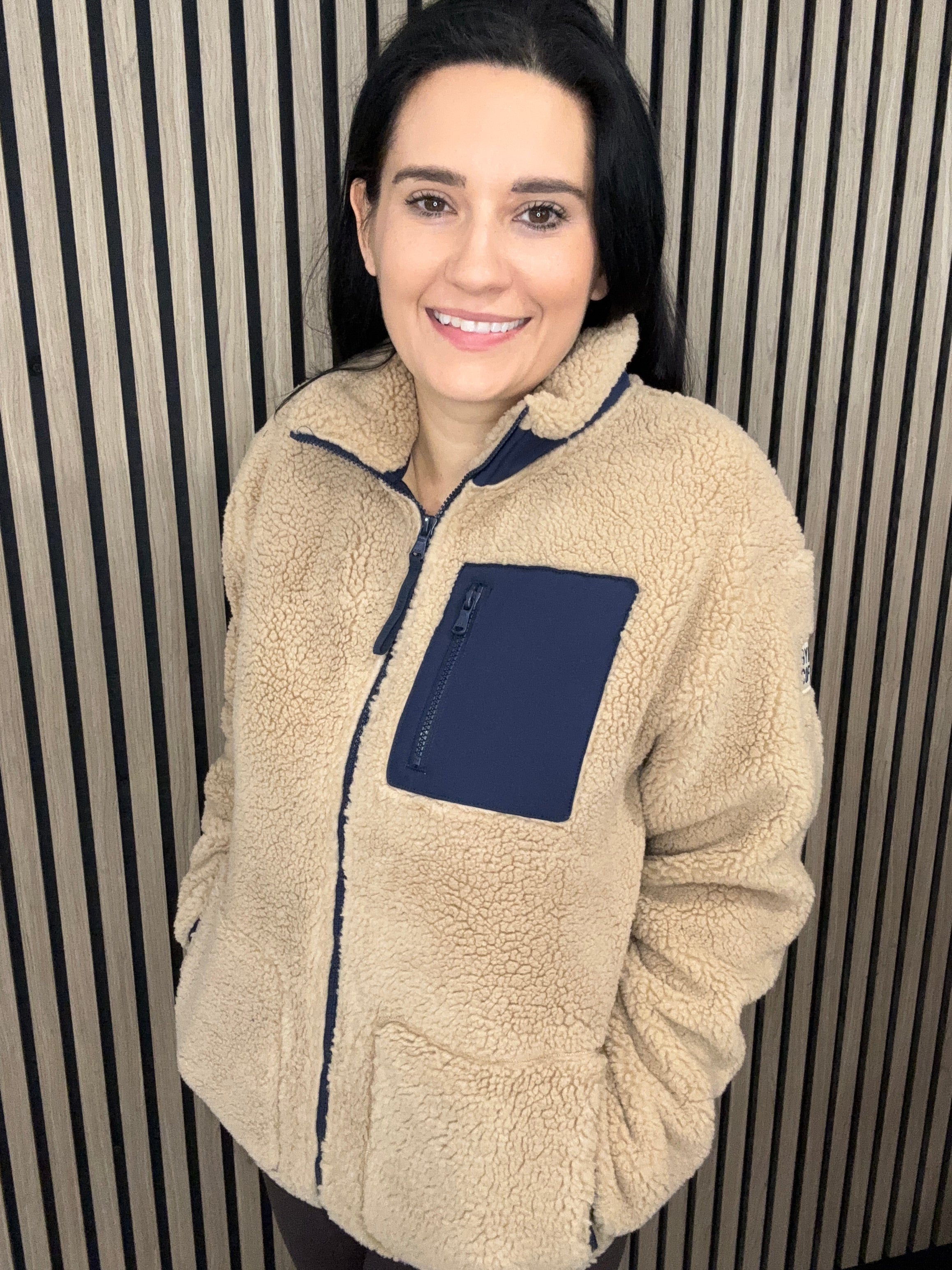 Industry High Collar Fleece Jacket in Sandstone with navy