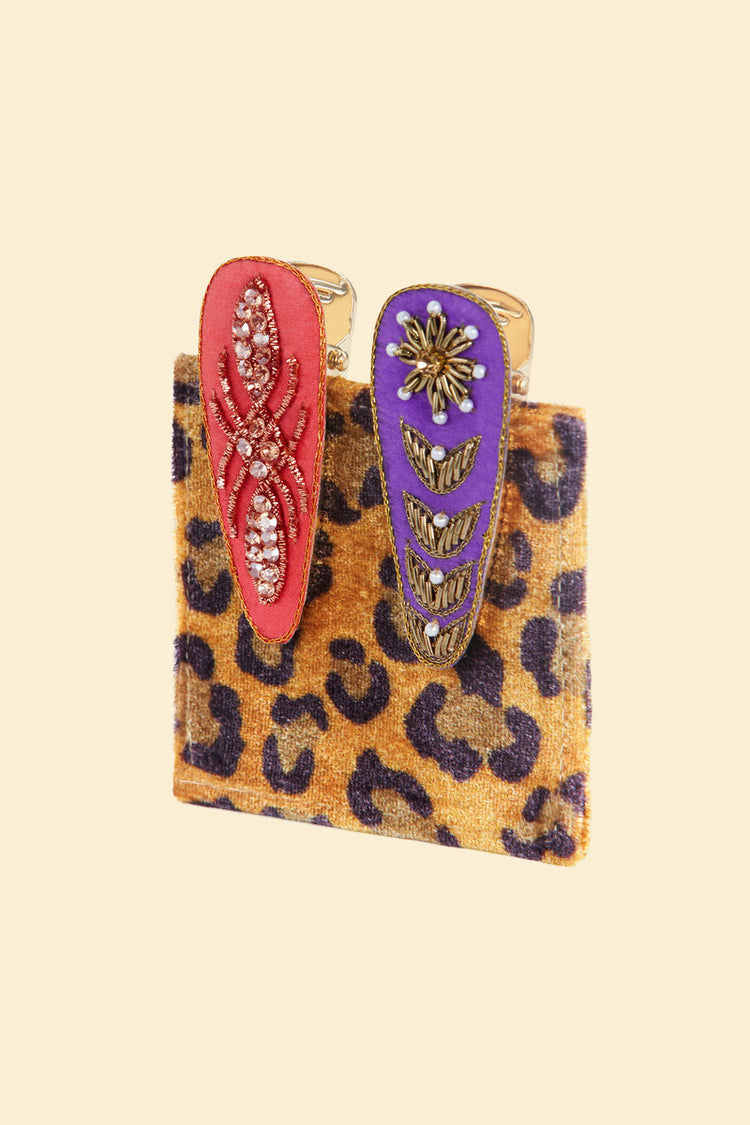 Get ready to elevate your elegance levels to new heights with these contrasting velvet hair clips. Hand embroidered in India, These come on a velvet card and with the cutest gift bag ever - they will make the perfect gift for party season.