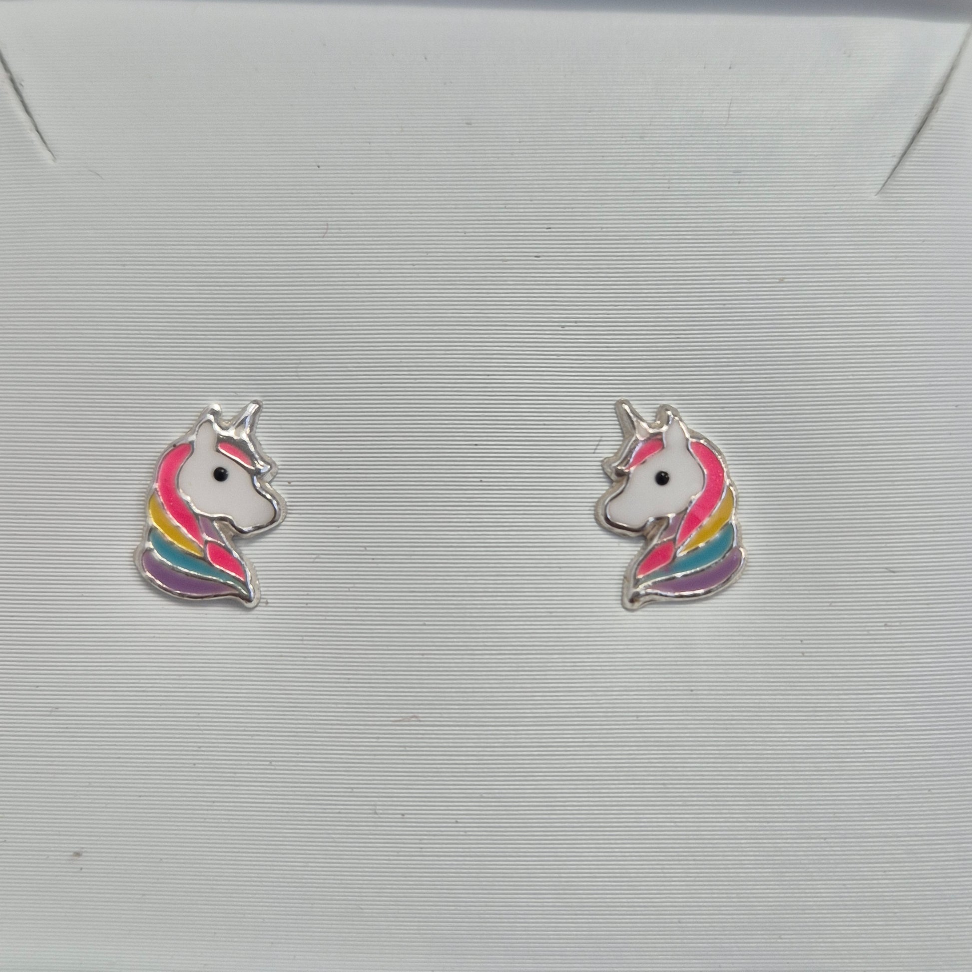 Sterling silver multi-coloured unicorn earrings. All our kids jewellery is high quality and hypoallergic.
