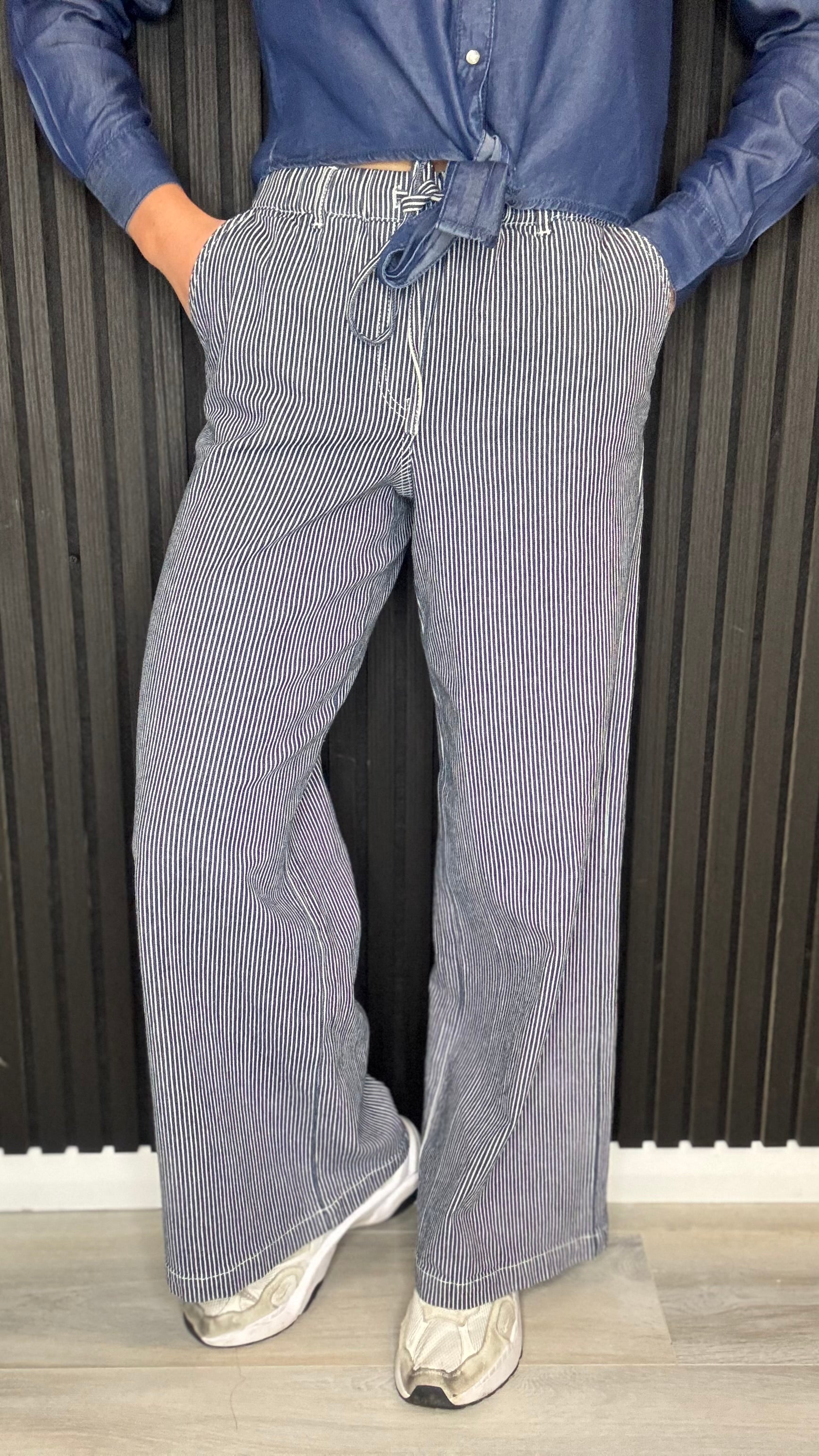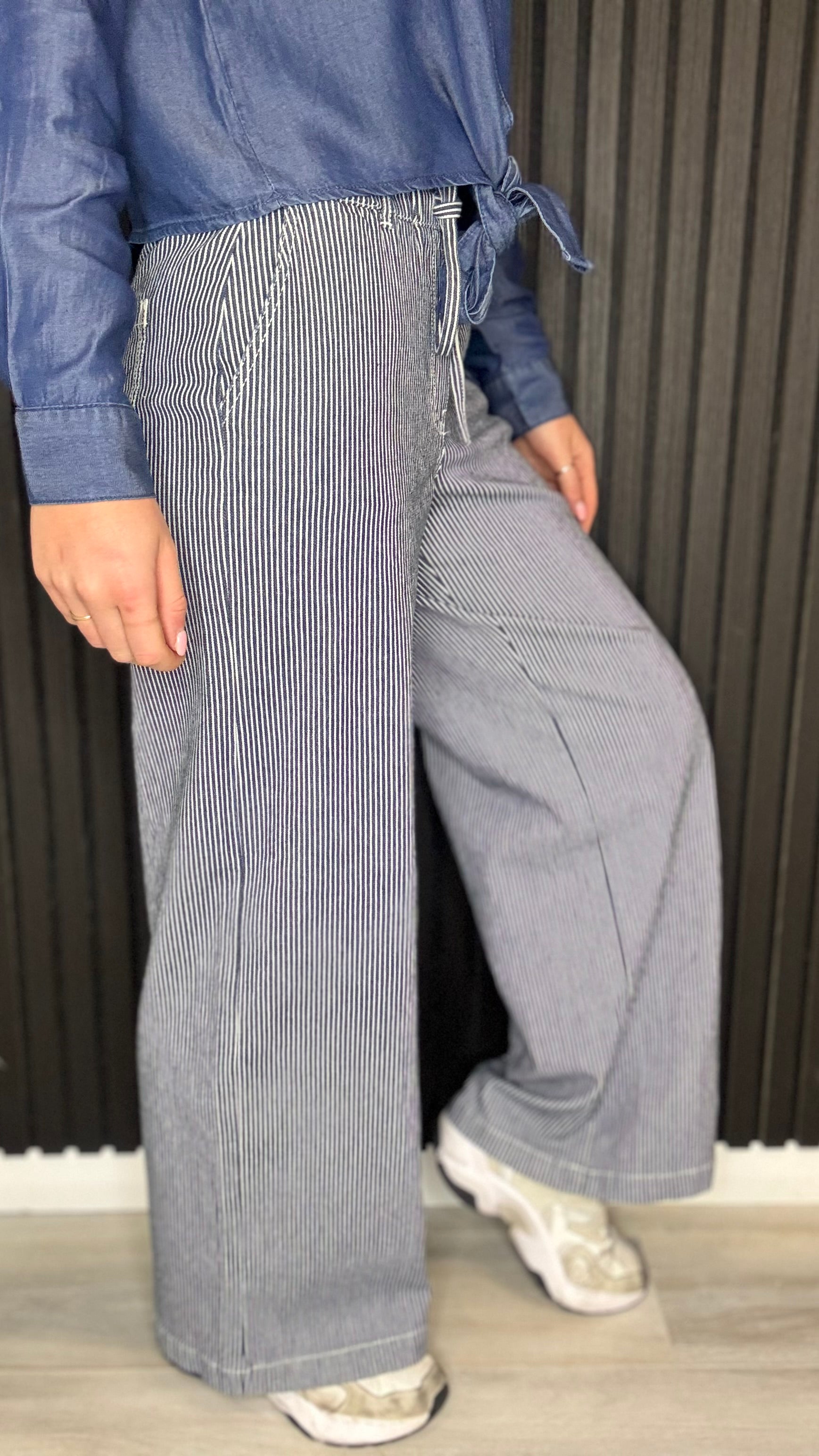 Meet your new everyday favorite. These relaxed wide-leg trousers blend effortless comfort with timeless style. Designed in a lightweight pinstripe fabric, they feature an elasticated waist with adjustable drawstring for an easy, flattering fit that moves with you.
