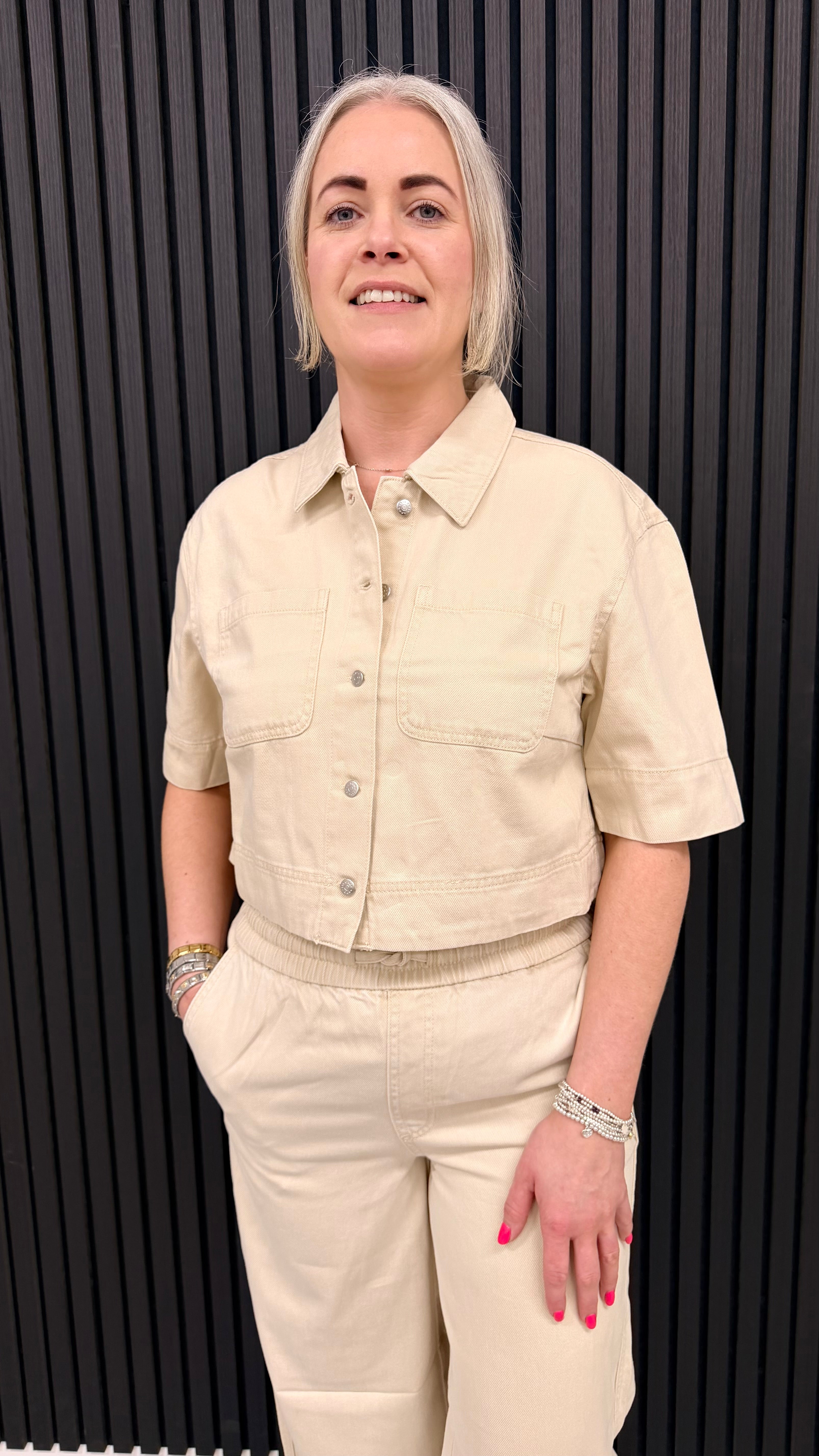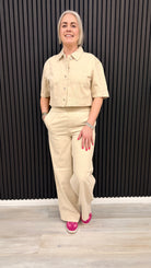 Women’s oatmeal wide leg trousers with high waist and relaxed fit. Comfortable and versatile neutral trousers.