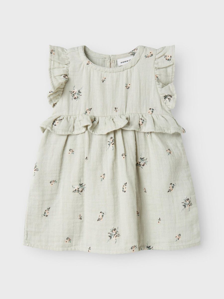 - Product type: Dress - Closing : Button fastening - Print : All over print - Neck : Round Neck - Sleeve : Cap sleeves - Extra details: Frills - Fit : Regular Fit - Attention : WARNING! Keep away from fire