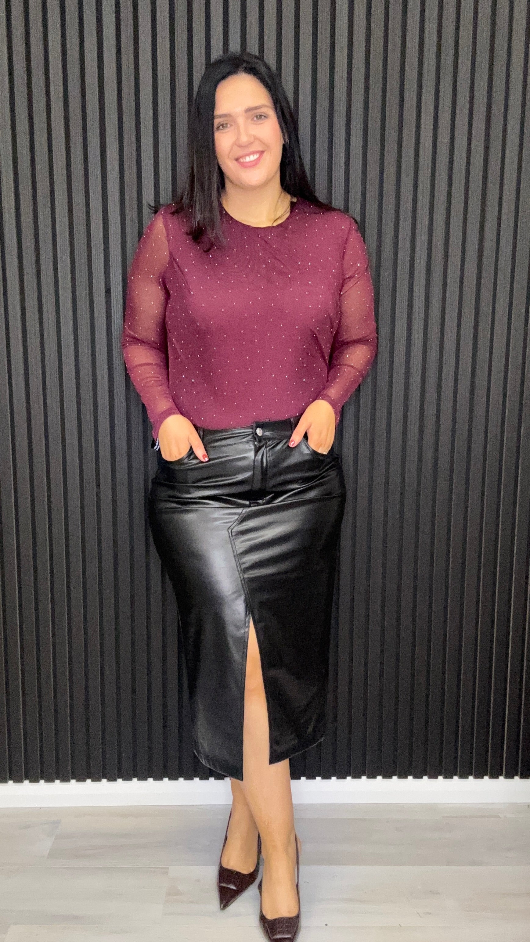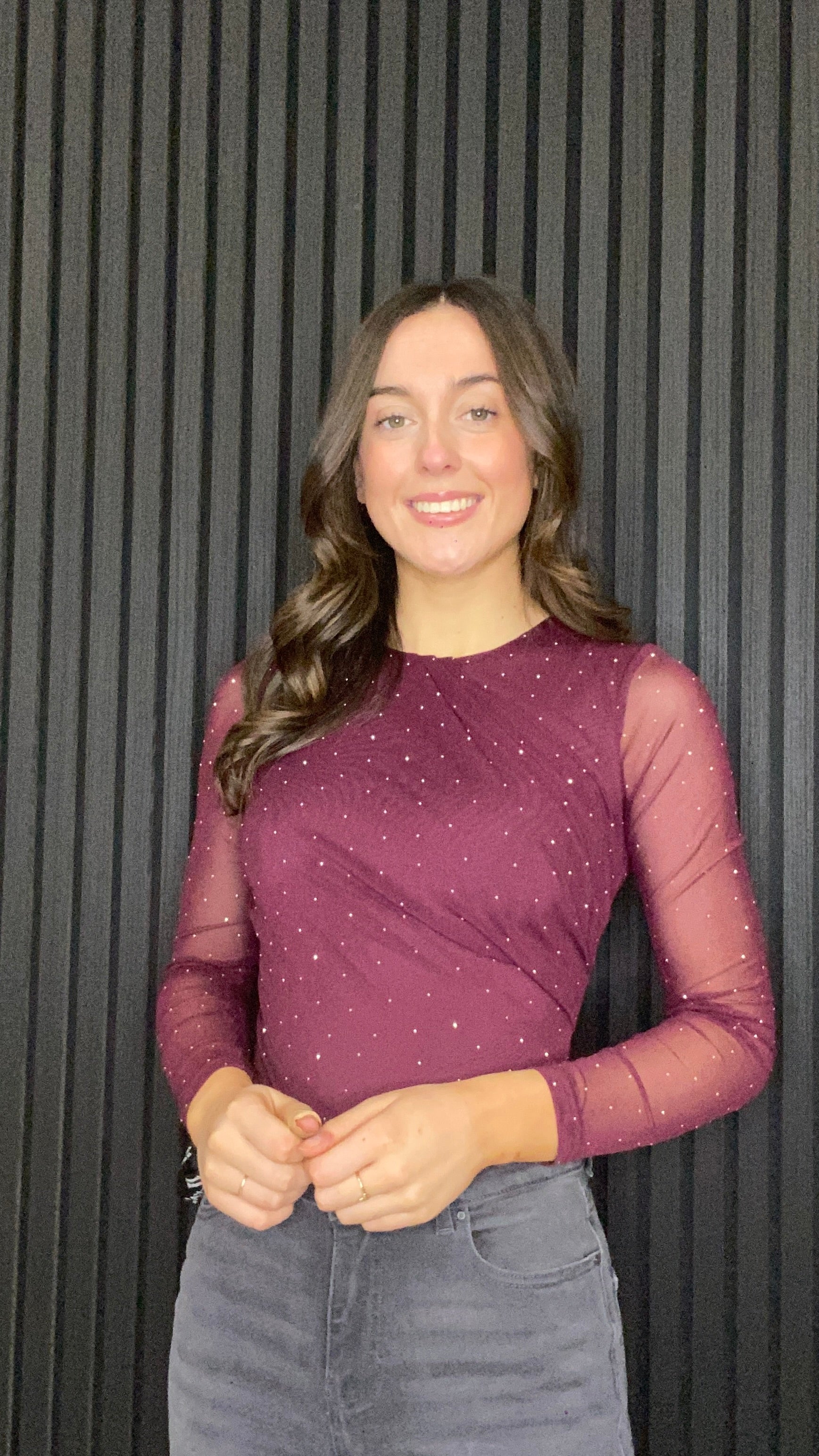 Be right on trend this party season in our Plum Diamante Long Sleeve Mesh Bodysuit. Crafted from our stunning diamante embellished mesh fabric, this bodysuit features a lined body, sheer mesh sleeves, pleated detailing on the neckline and side, and snap bottom fastening. Pair it with leather looks, heels and your favourite jewelry to add some sparkle to your evening look.