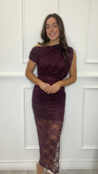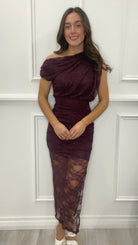 Feel sophisticated all night long in our Plum Lace Overlay Off The Shoulder Midi Dress. Featuring all over lace fabric with mini length lining, an open off the shoulder neckline, ruched shoulder detailing, a draped top effect, side zip closure, and a ruched sides midi skirt with a side split. Pair it with some statement jewellery and heels for a chic eye catching look.