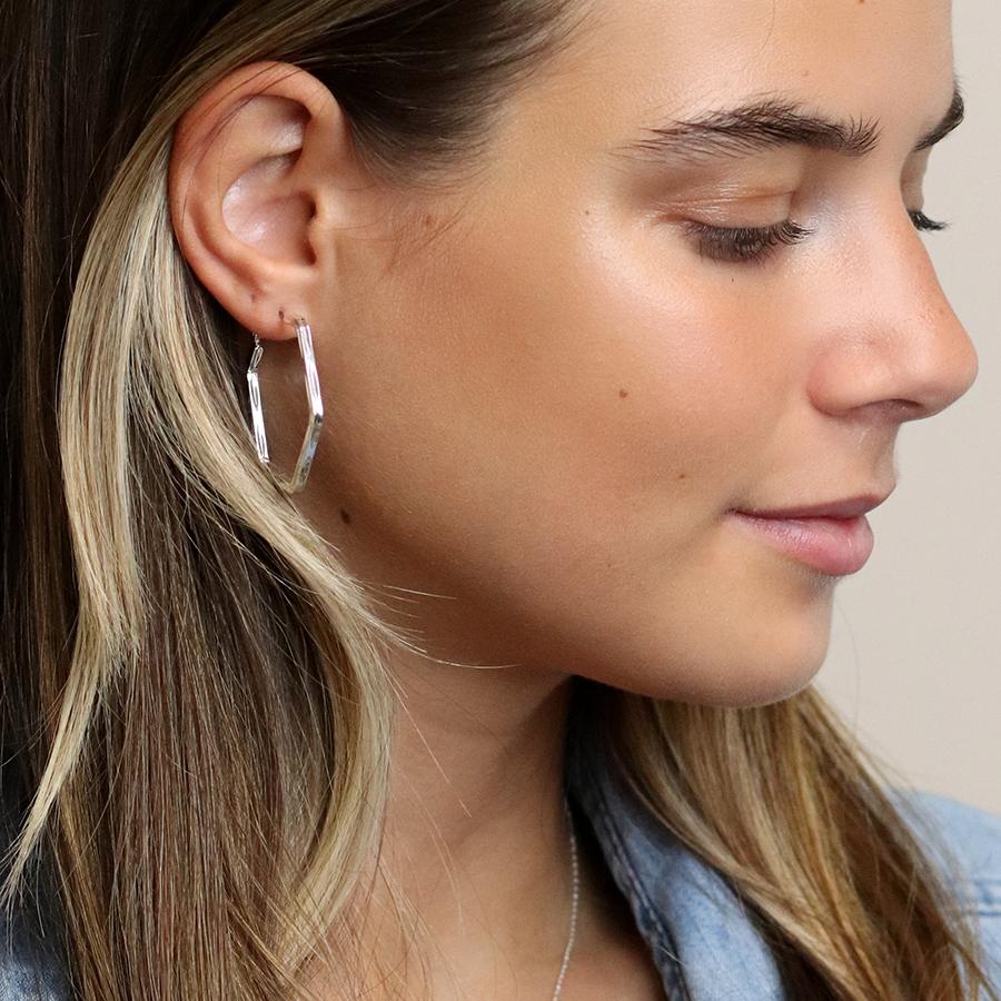 Silver plated hexagon hoop earrings with textured surface and hinged fastening