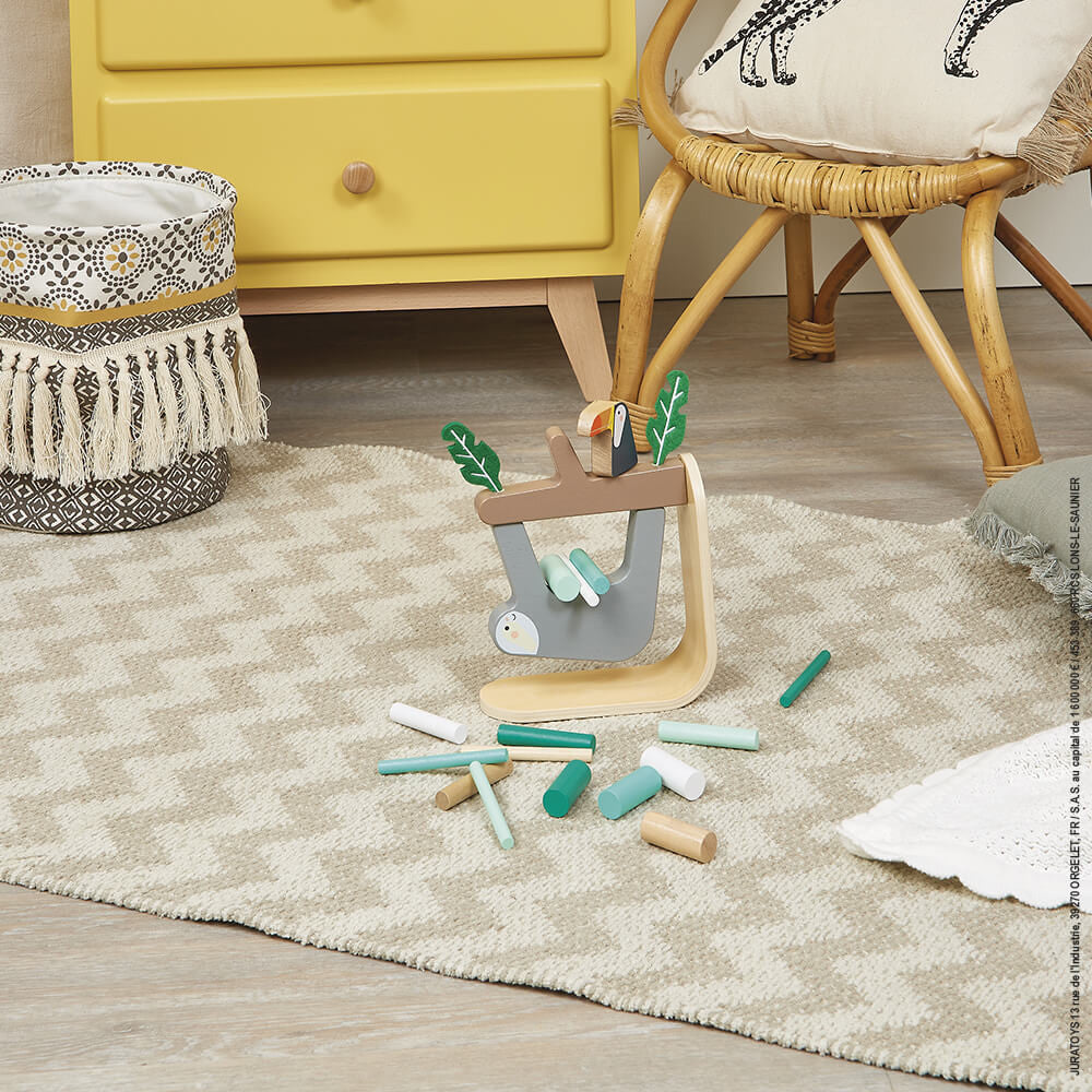 Our sloth is just taking a nap. But he’s forgotten something: it’s playtime! Rise and shine for this attractive wooden game of skill for kids aged 3 and over! This balancing game features a sloth hanging from its branch, and 15 sticks. It can be played by one or more players. The aim of the game? Put as many sticks on the sloth’s belly as you can before it lets go of the branch! The player who puts on one stick too many is the loser! Each leave in this pretty game is made of soft felt. This game is perfect for developing patience and dexterity. FSC®-certified game (wood from sustainably managed forests)
