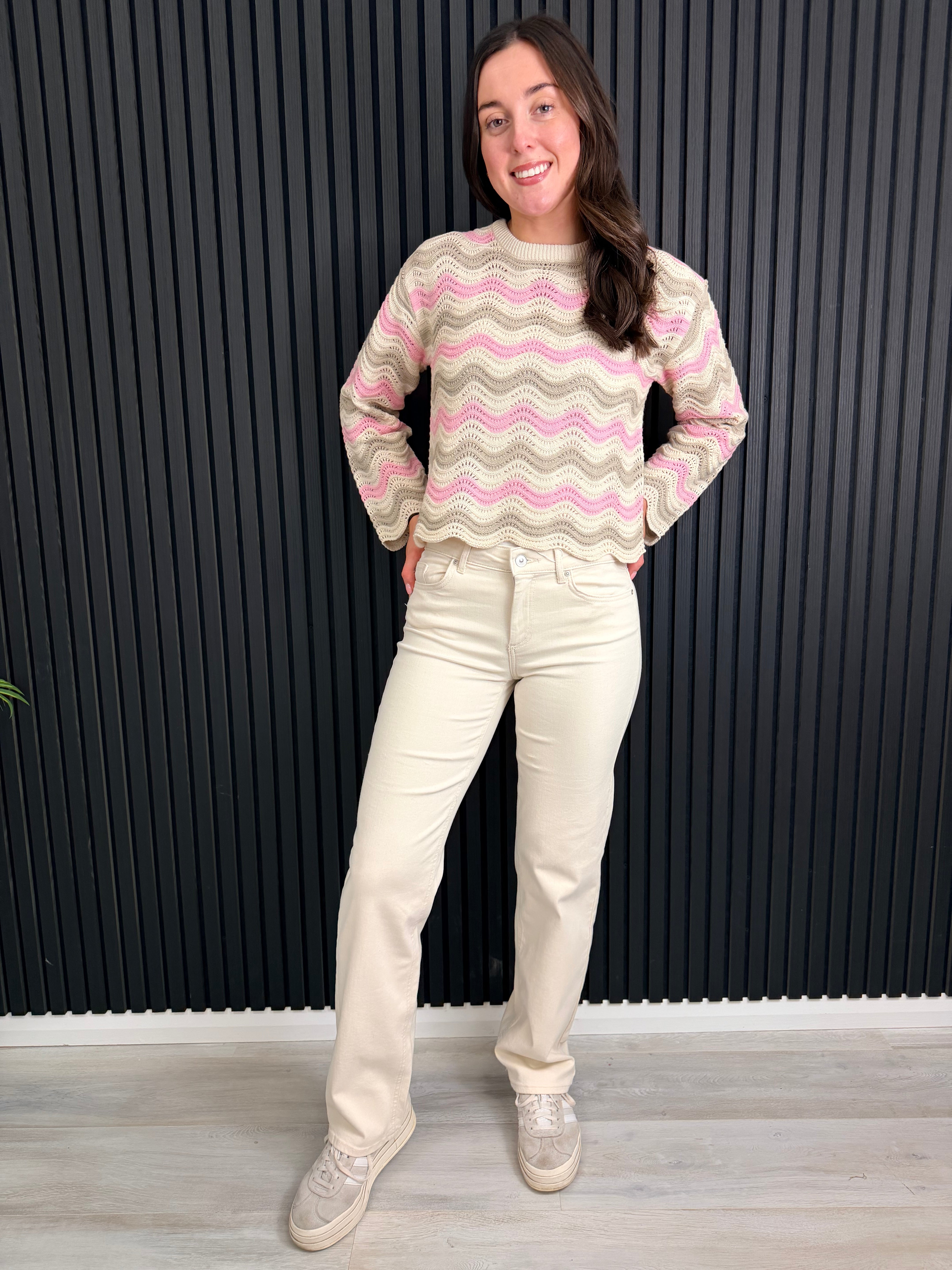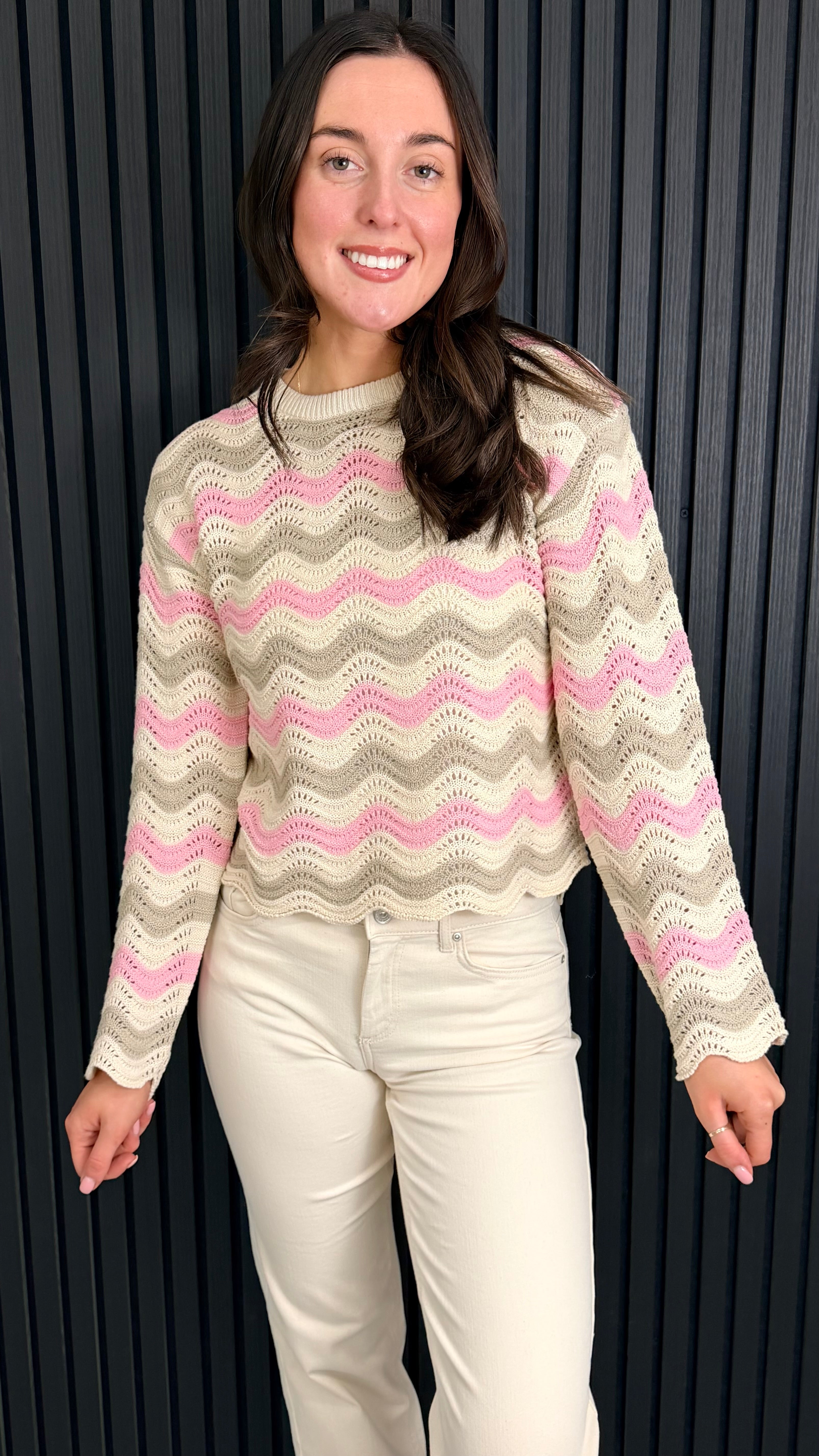 A soft, lightweight knit with a playful wave zigzag pattern in pink and neutral tones. Easy to wear, easy to style, and perfect for everyday comfort with a subtle pop of fun.